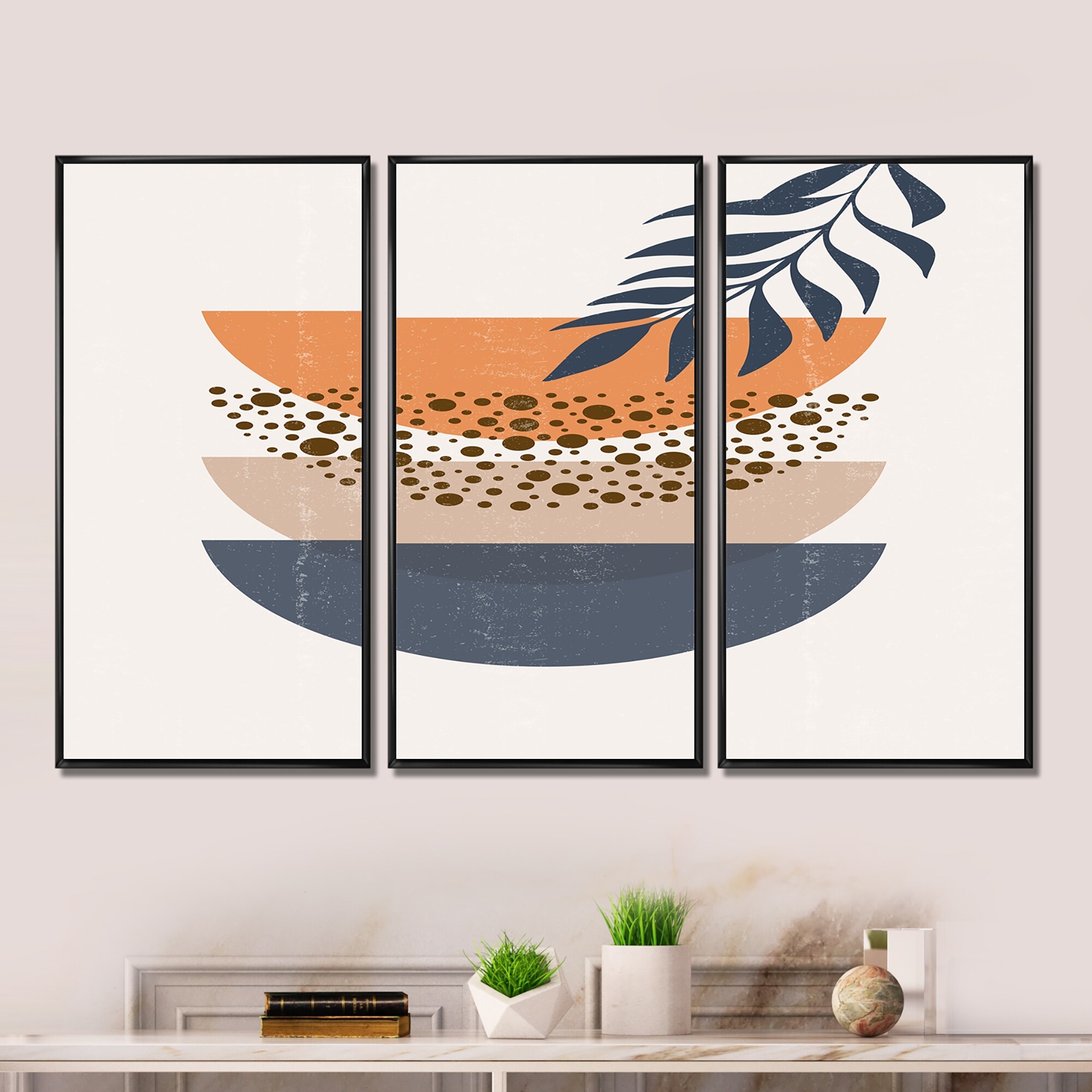 Designart "Abstract Geometrical Sun and Moon With Leaf IV" Modern Framed Art Prints Set of 3 - 4 Colors of Frames