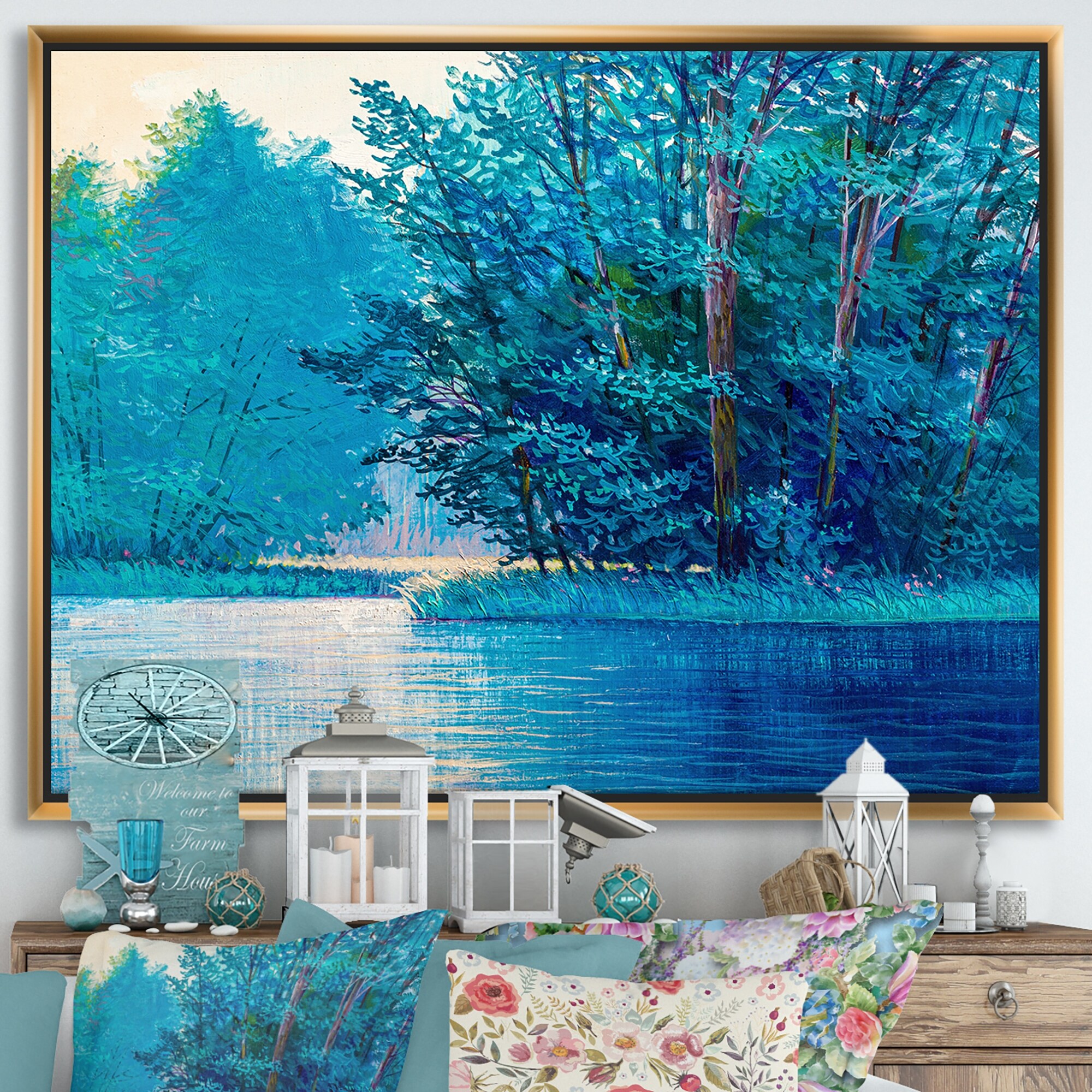 Designart "Summer Forest With River And Waterfall" Farmhouse Framed Canvas Wall Art Print