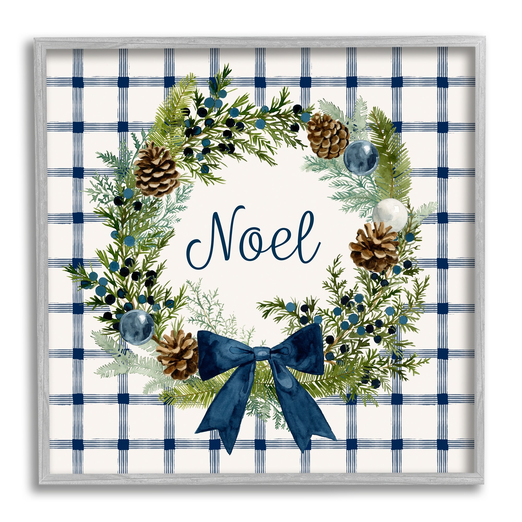 Stupell Winter Noel Sentiment Pinecone Wreath Blue Plaid Framed Wall Art