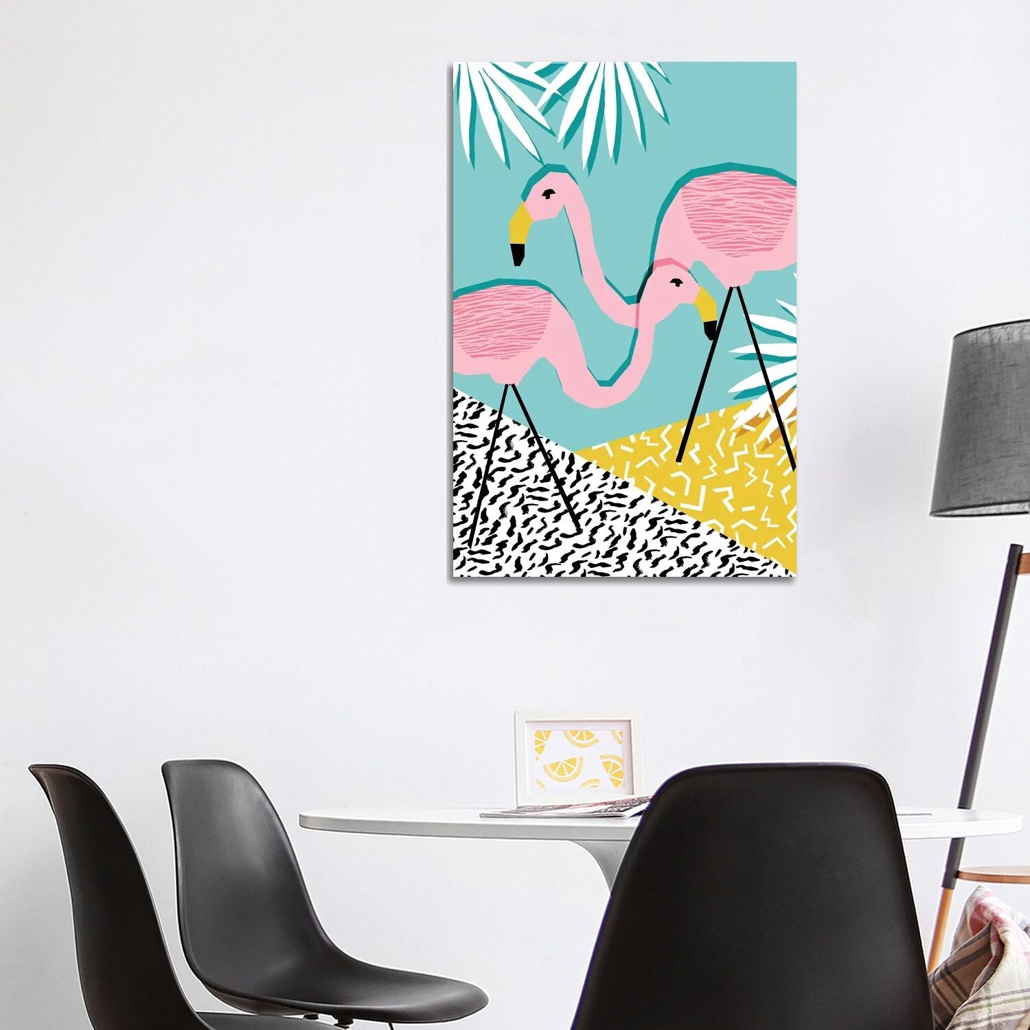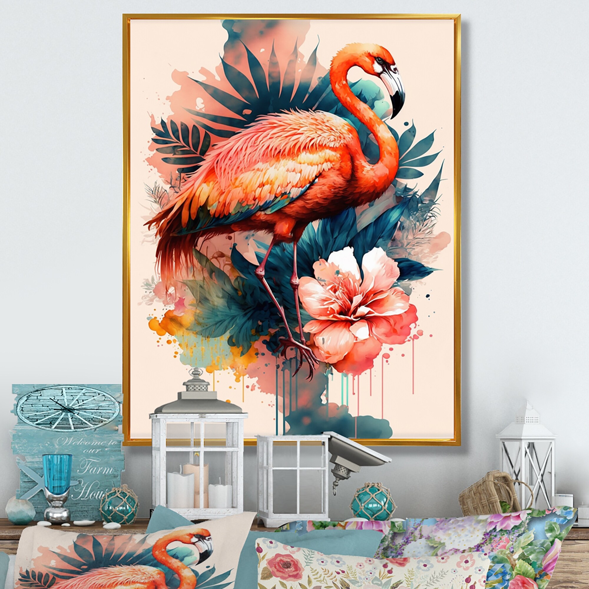 Designart "Cute Flamingos Floral Art V" Animals Framed Canvas Art Print