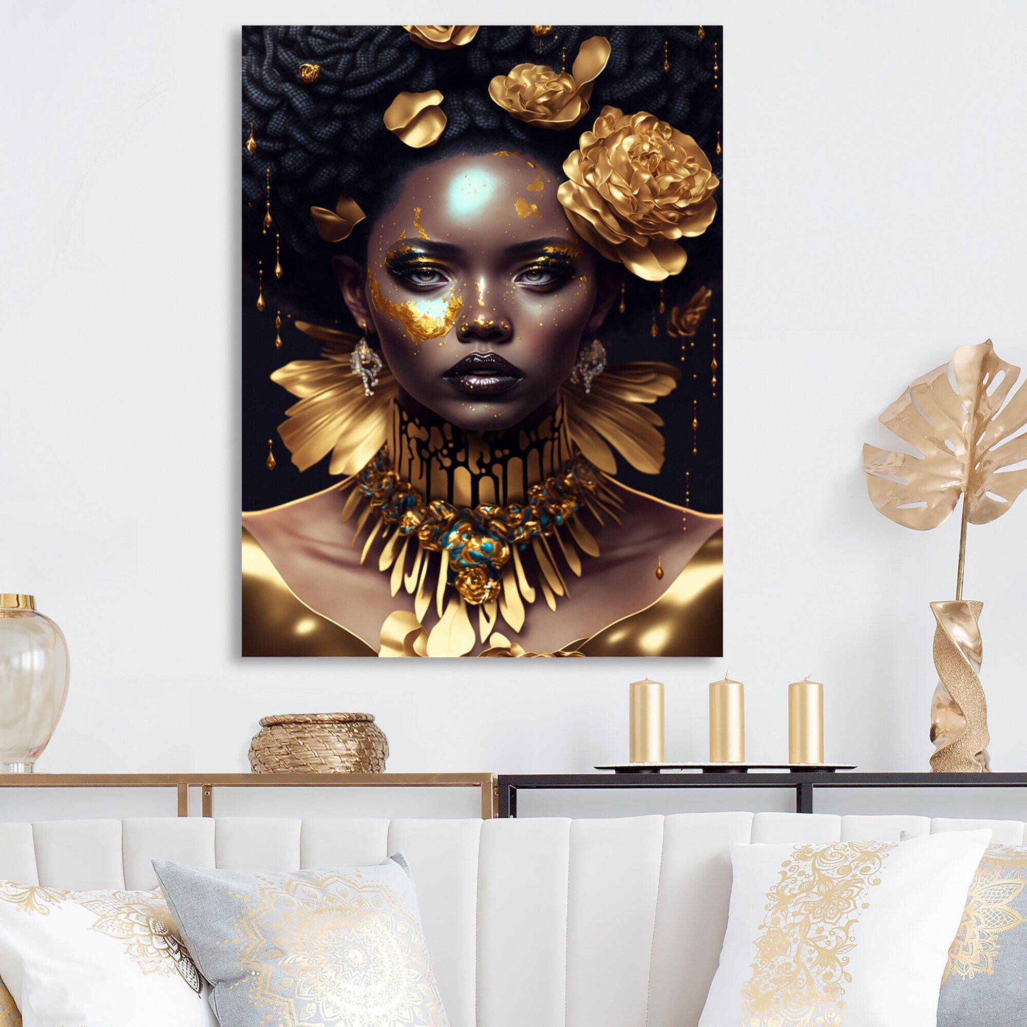 Designart 'Gold And Black Floral Woman VI' Contemporary Glam Canvas Wall Art