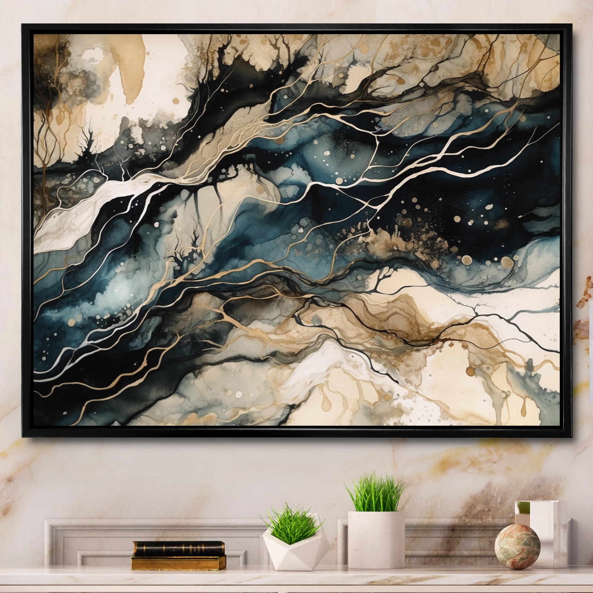 Designart "Blue Beige Marbled Dreamscape Iii" Modern Geometric Framed Wall Art for Living Room