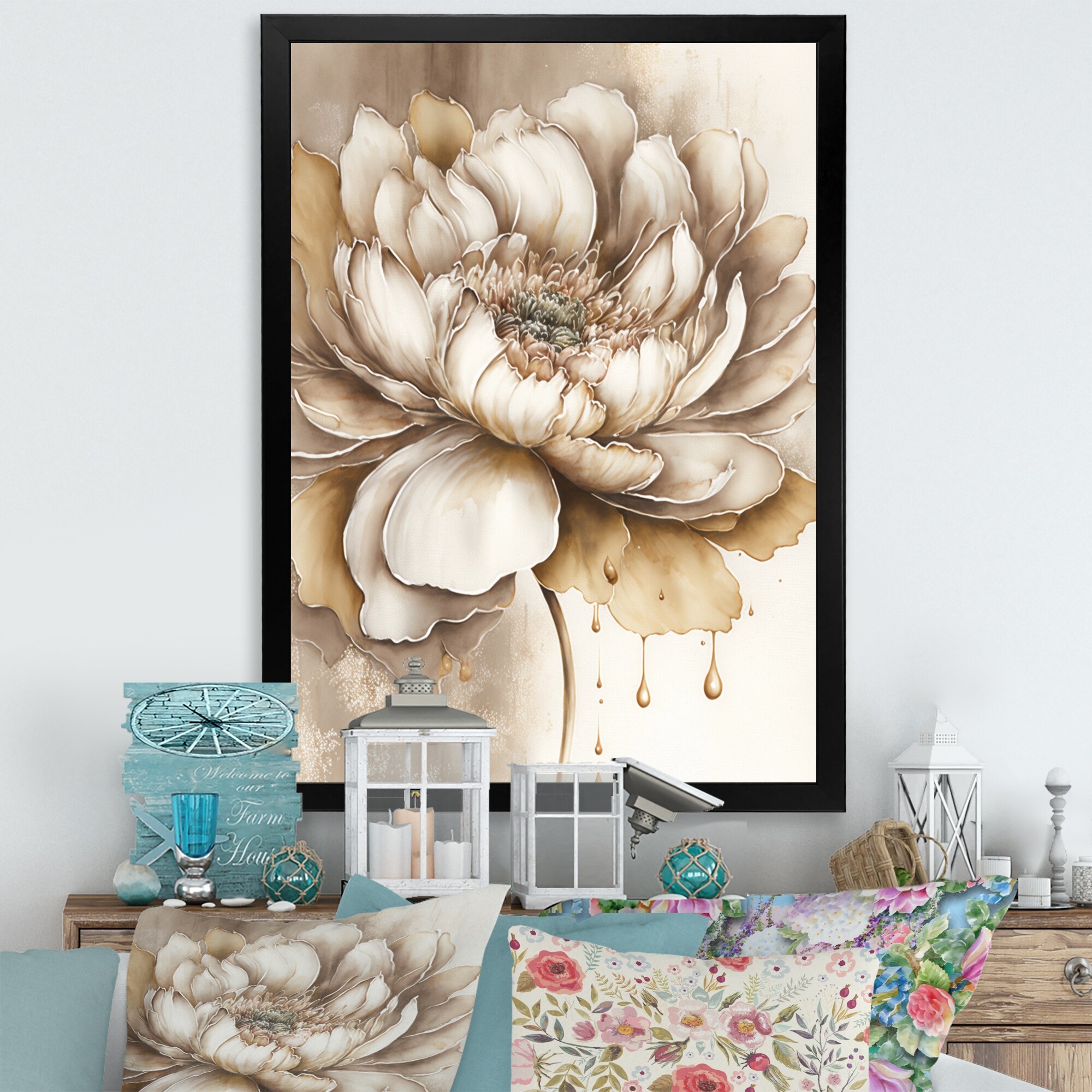 Designart "Indigold Beige Flower II" Floral & Botanical Framed Art Print