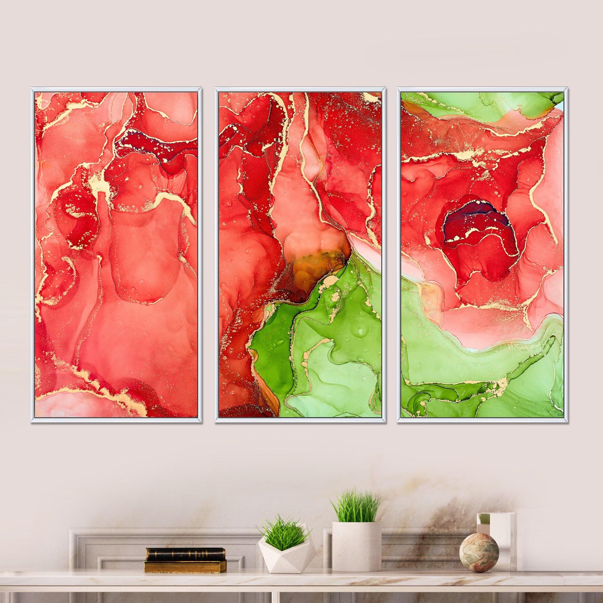 Designart "Red And Green Luxury Abstract Fluid Art" Modern Framed Canvas Wall Art Print Set of 3 - 4 Colors of Frames