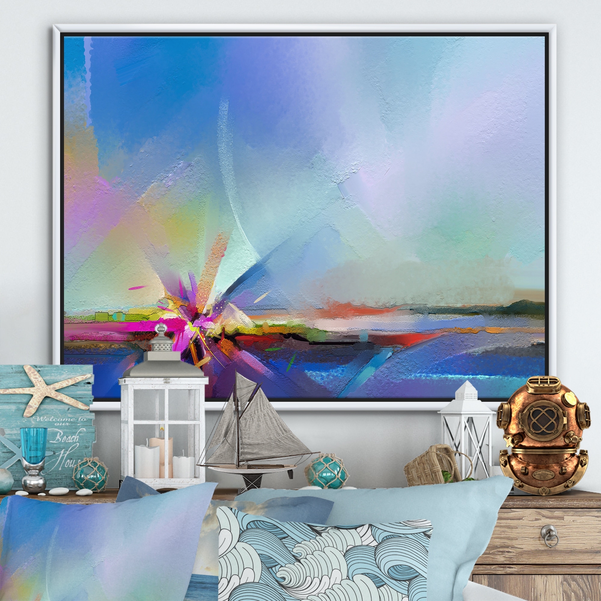 Designart "Abstract Colorful Seascape VII" Modern Framed Canvas Wall Art Print