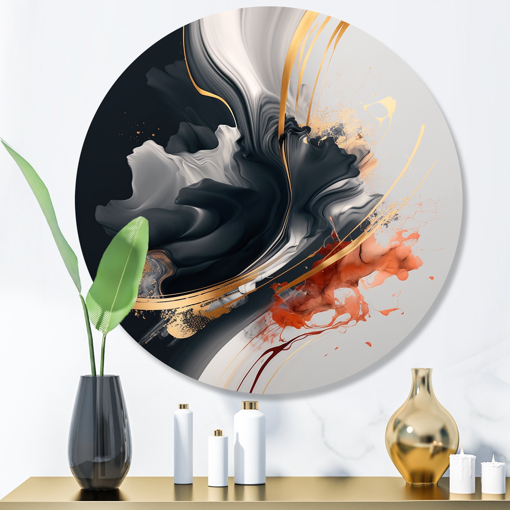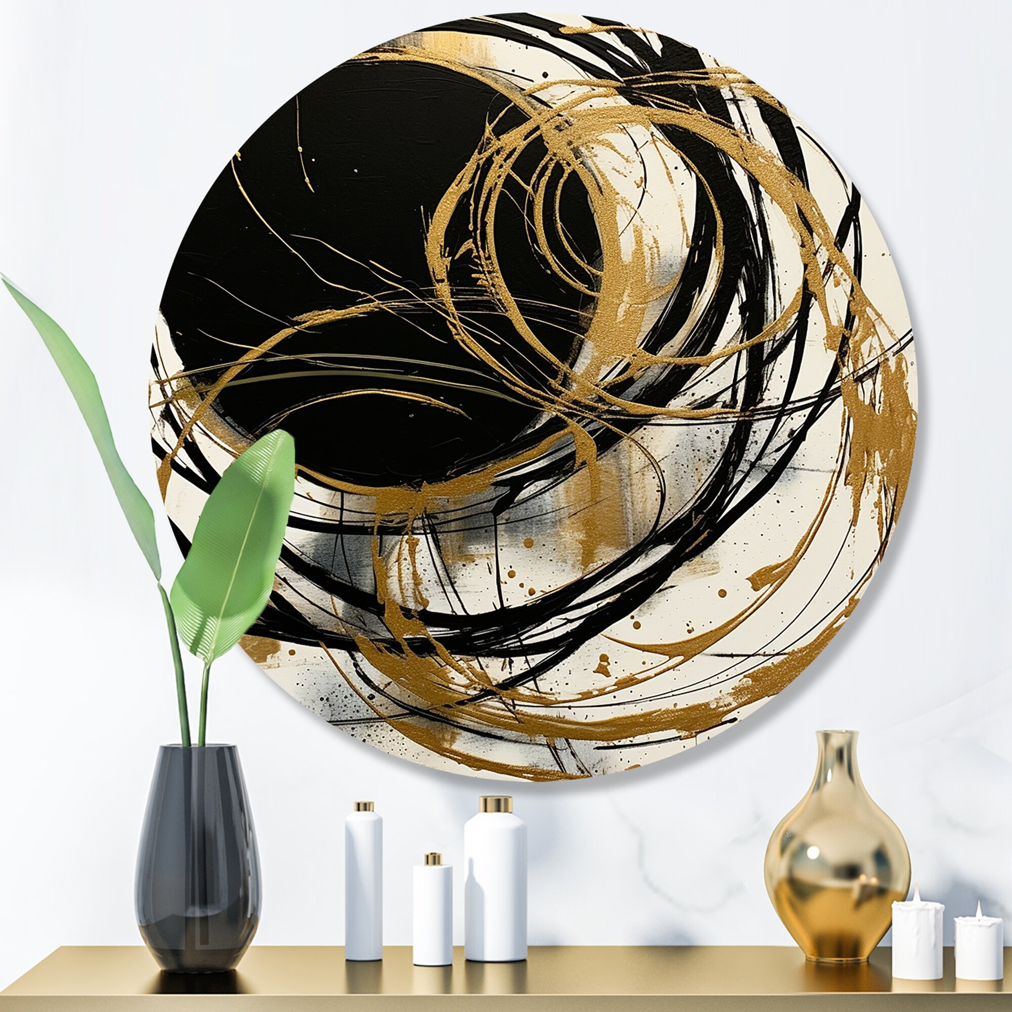 Designart "Black And Gold the Art of Chaos V" Abstract Painting Metal Round Wall Art