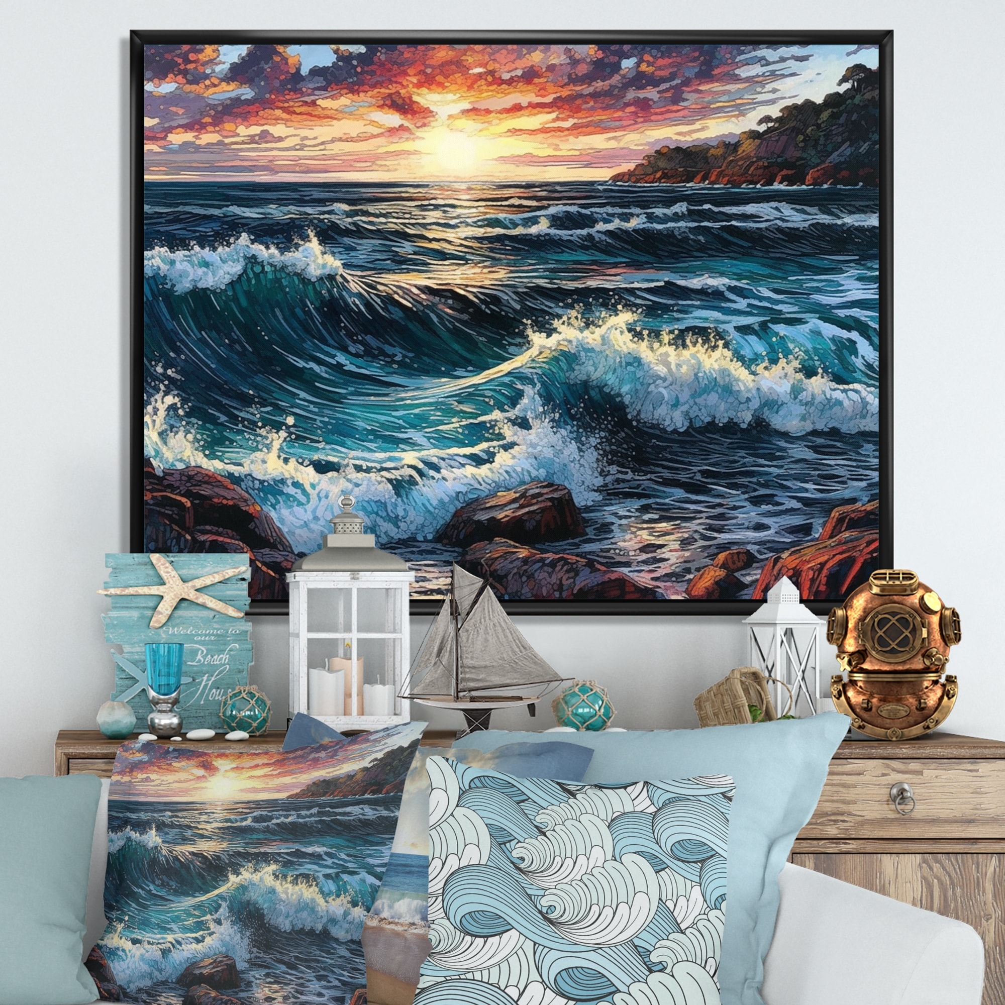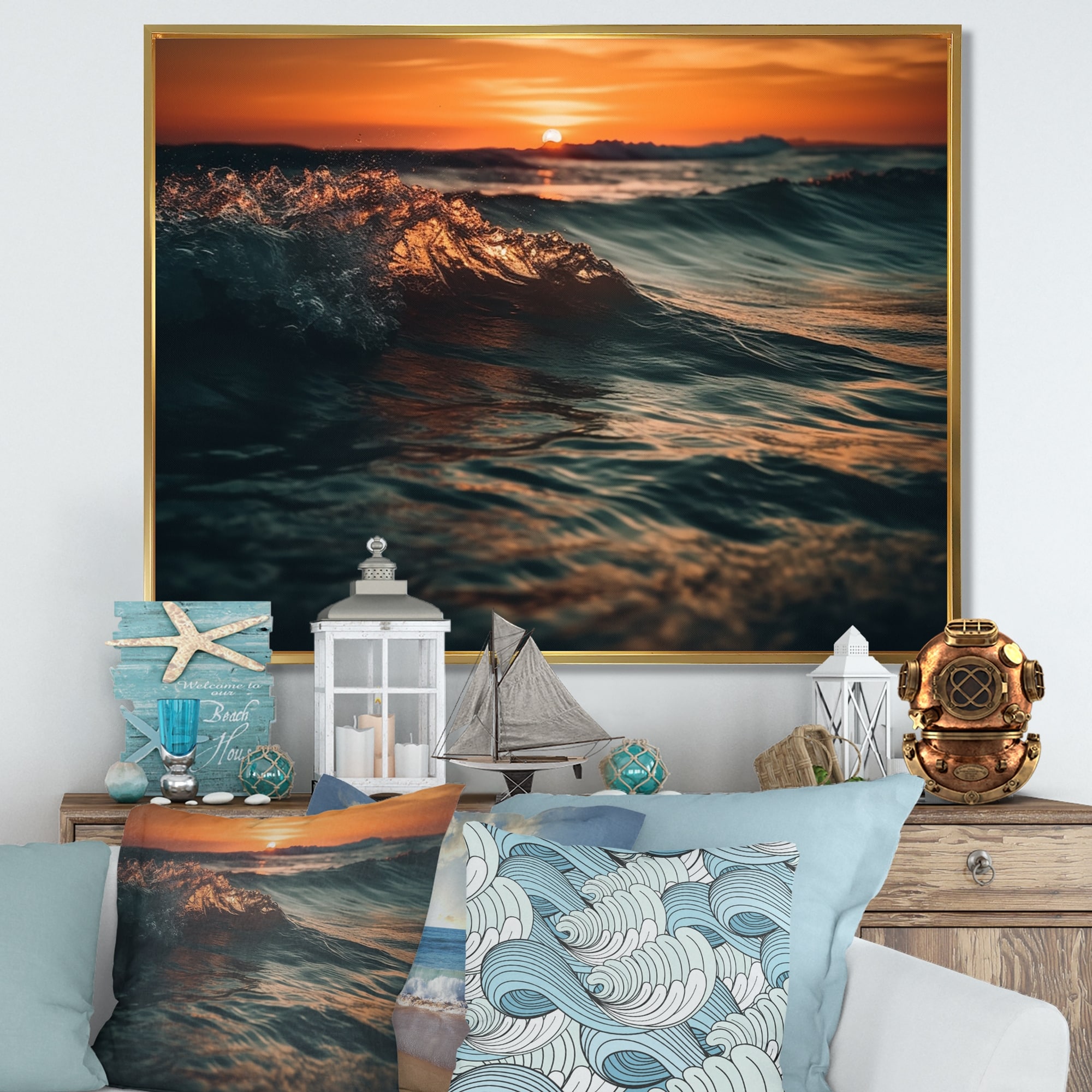 Designart "Green Sunset At the Beach V" Modern Landscape Beach Framed Canvas Prints