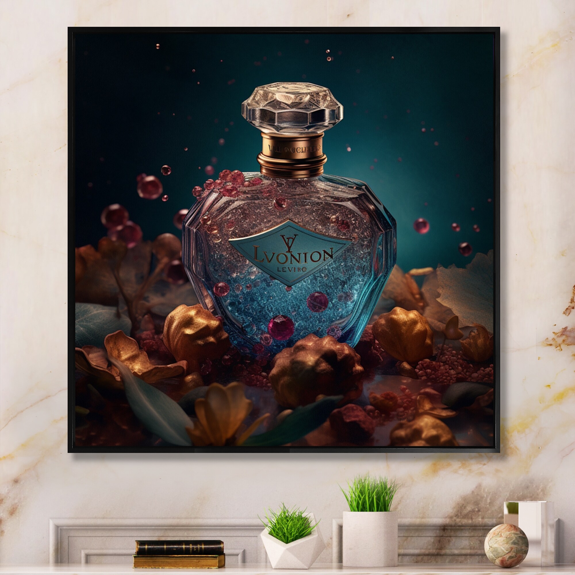 Designart "Blue Captivating Perfume Glasswork Ii" Fashion Perfume Framed Wall Art for Living Room