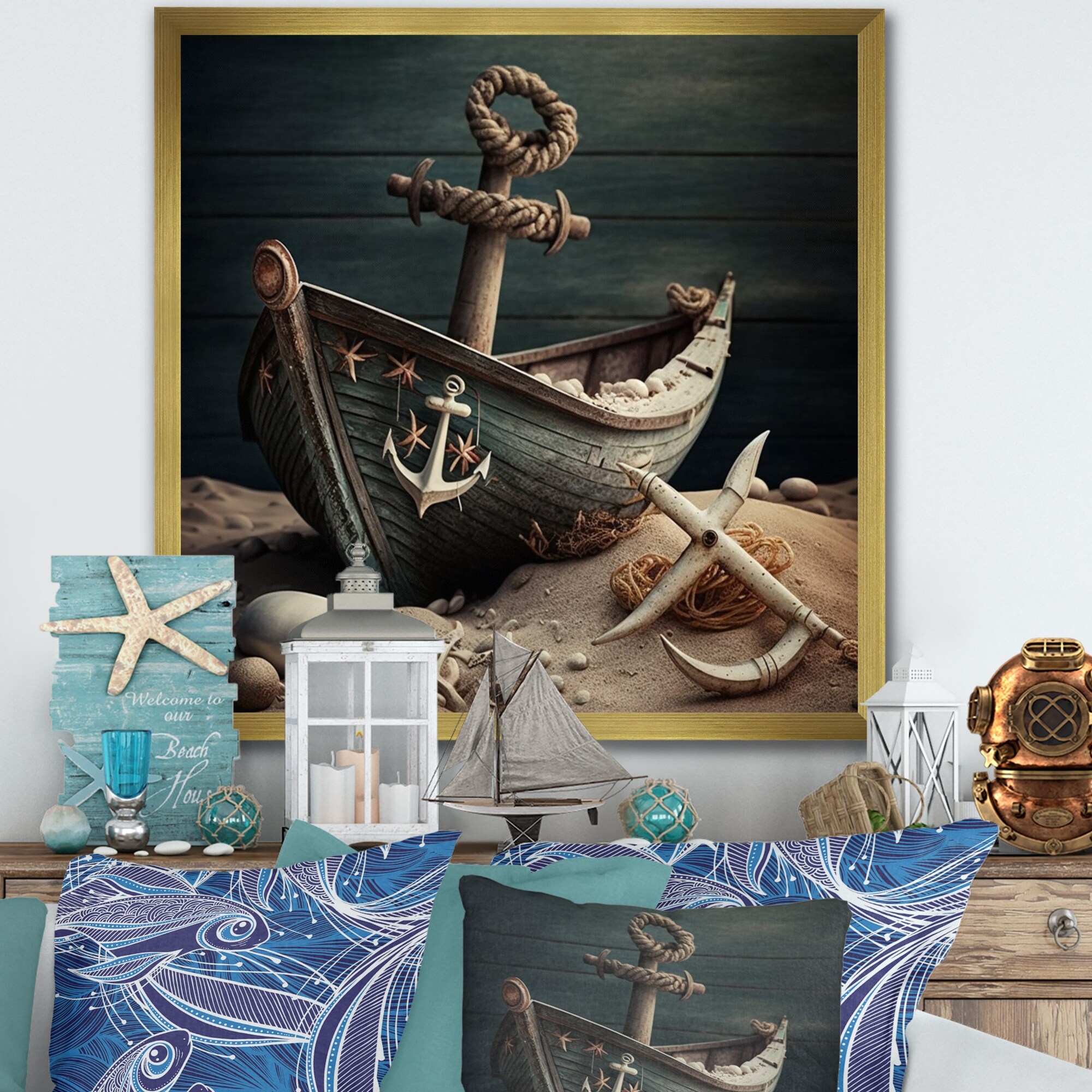 Designart "Greenboat On Shore" Coastal Boat Framed Canvas Print