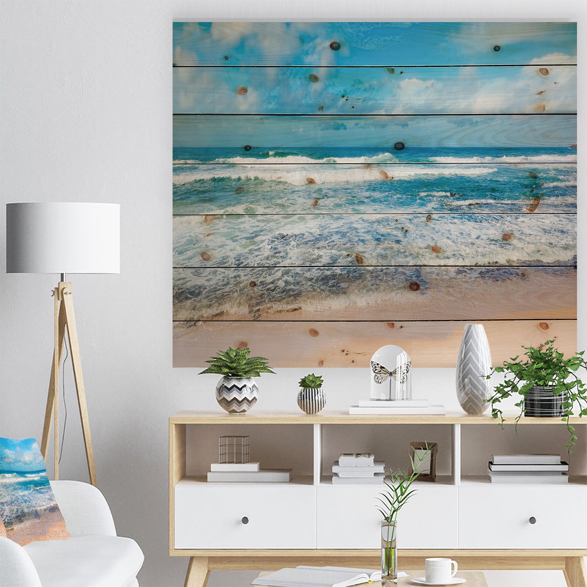 Designart 'Blue Sky and Clouds Mirrored in Sea' Seashore Print on Natural Pine Wood - Blue