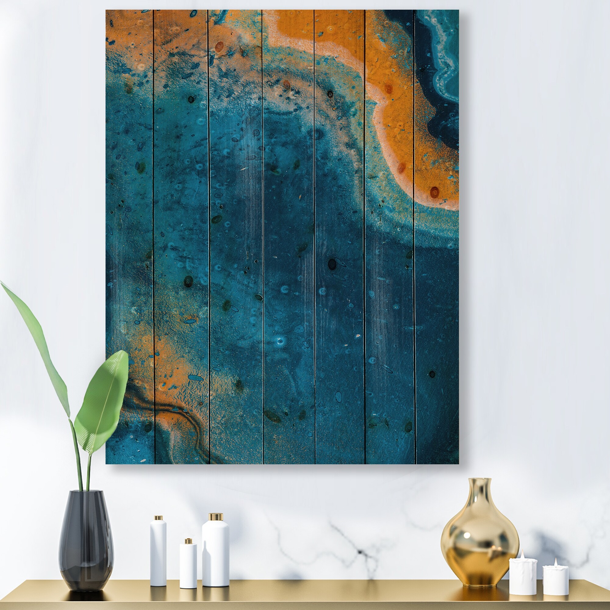 Designart 'Abstract Marble Composition in Blue and Orange V' Modern Print on Natural Pine Wood
