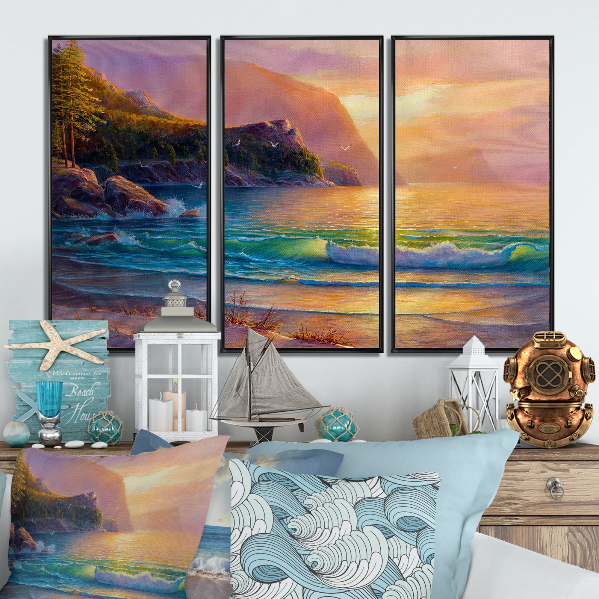Designart "Romantic Beach During Warm Sunset" Nautical & Coastal Framed Canvas Wall Art Print Set of 3 - 4 Colors of Frames