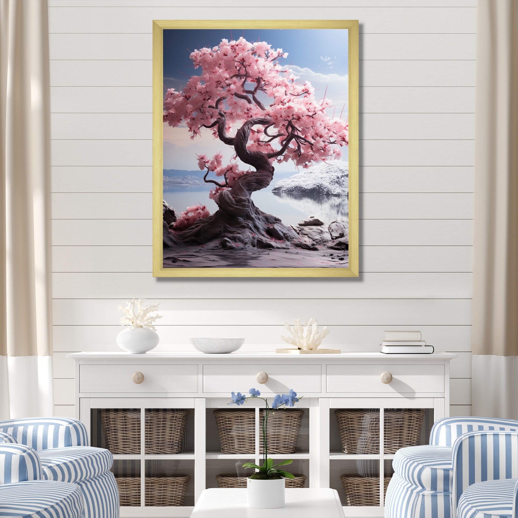 Designart "Pink Blossoming Serenity II" Beach Framed Wall Art Prints