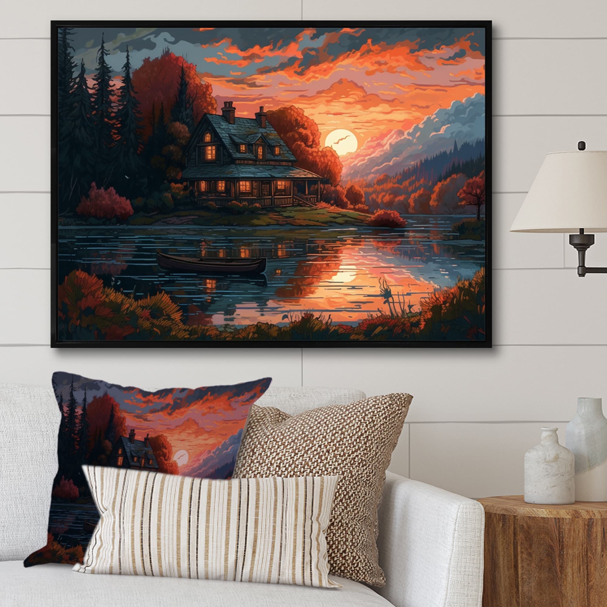 Designart "Autumn Sunset Cottage Ii" Cottage Landscape Framed Canvas Prints