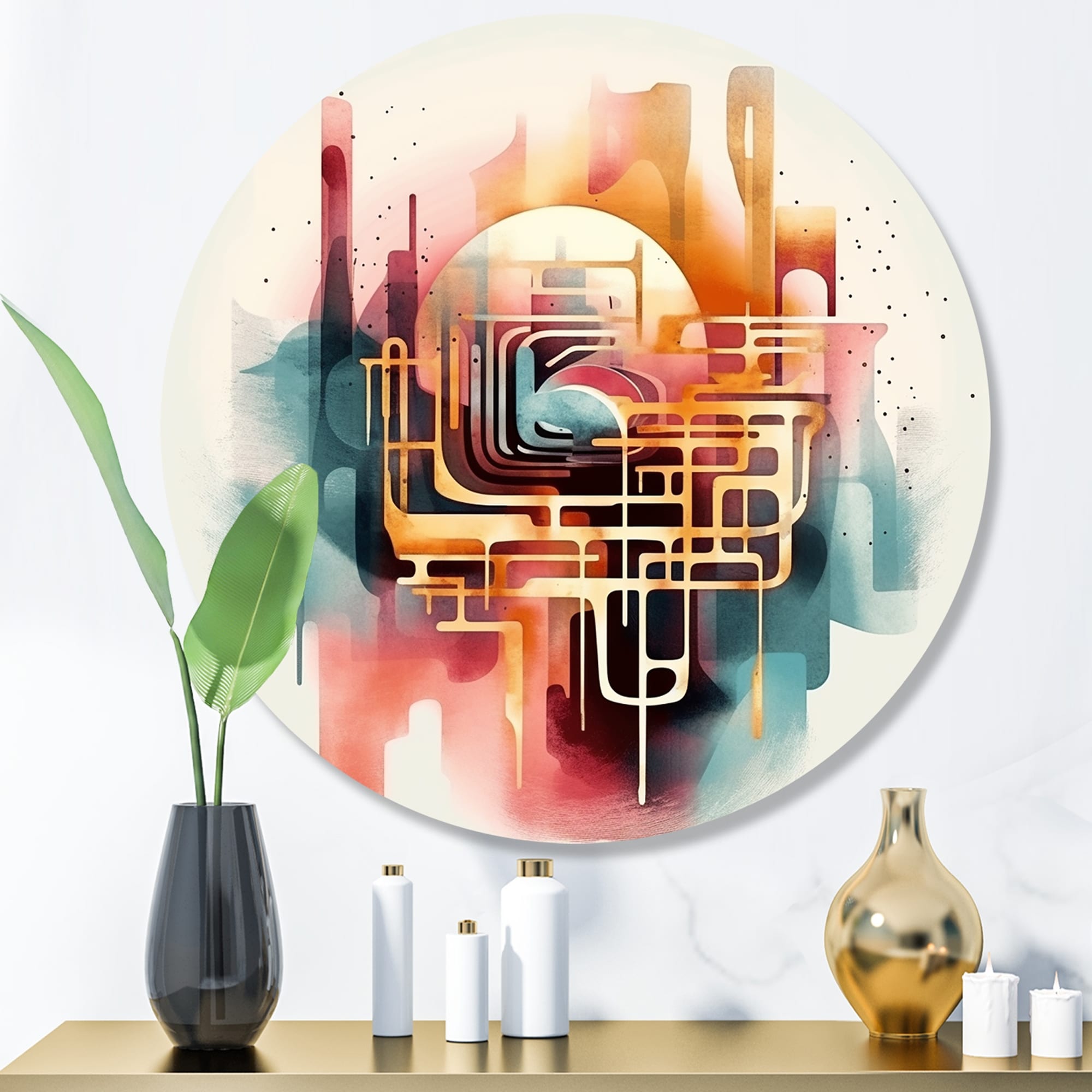 Designart "Orange Blue Abstract Maze III" Modern Geometric Metal Round Wall Art