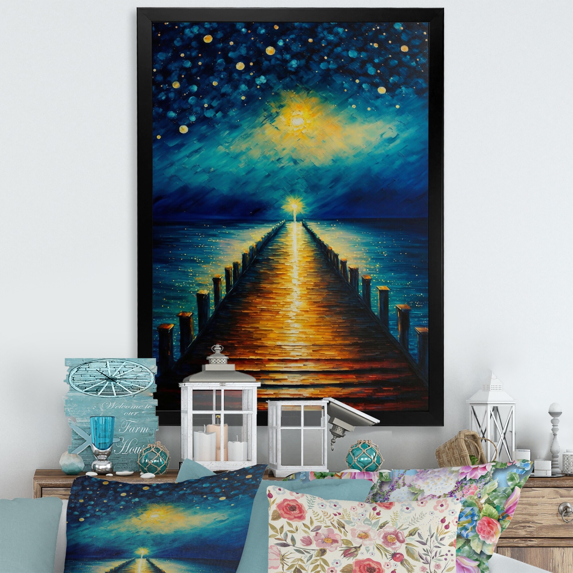 Designart "Light At the End of the Pier During Stormy Night II" Nautical & Beach Framed Art Print