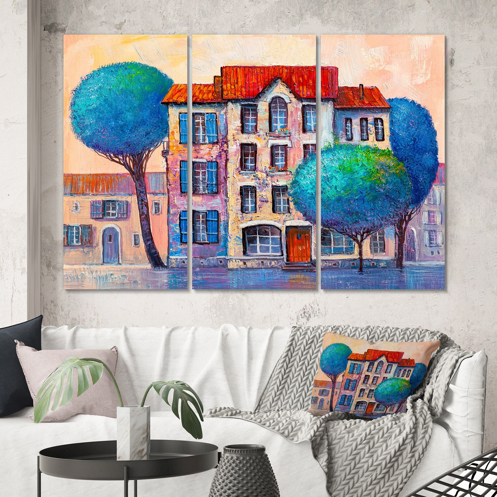 Designart "City View With Blue Leaves And Red Roofs" Industrial Canvas Wall Art Print