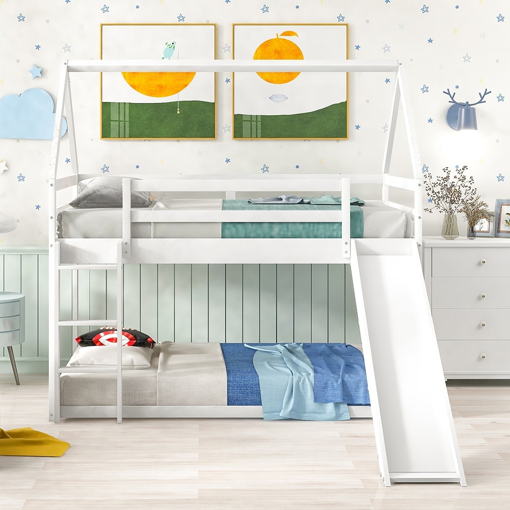 Twin Over Twin Size House Bunk Bed with Convertible Slide and Ladder
