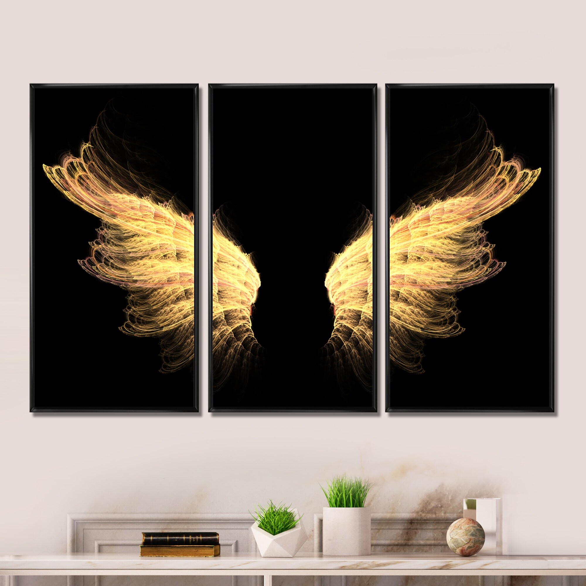 Designart "Hell Gold Wings" Abstract Framed Artwork Set of 3 - 4 Colors of Frames