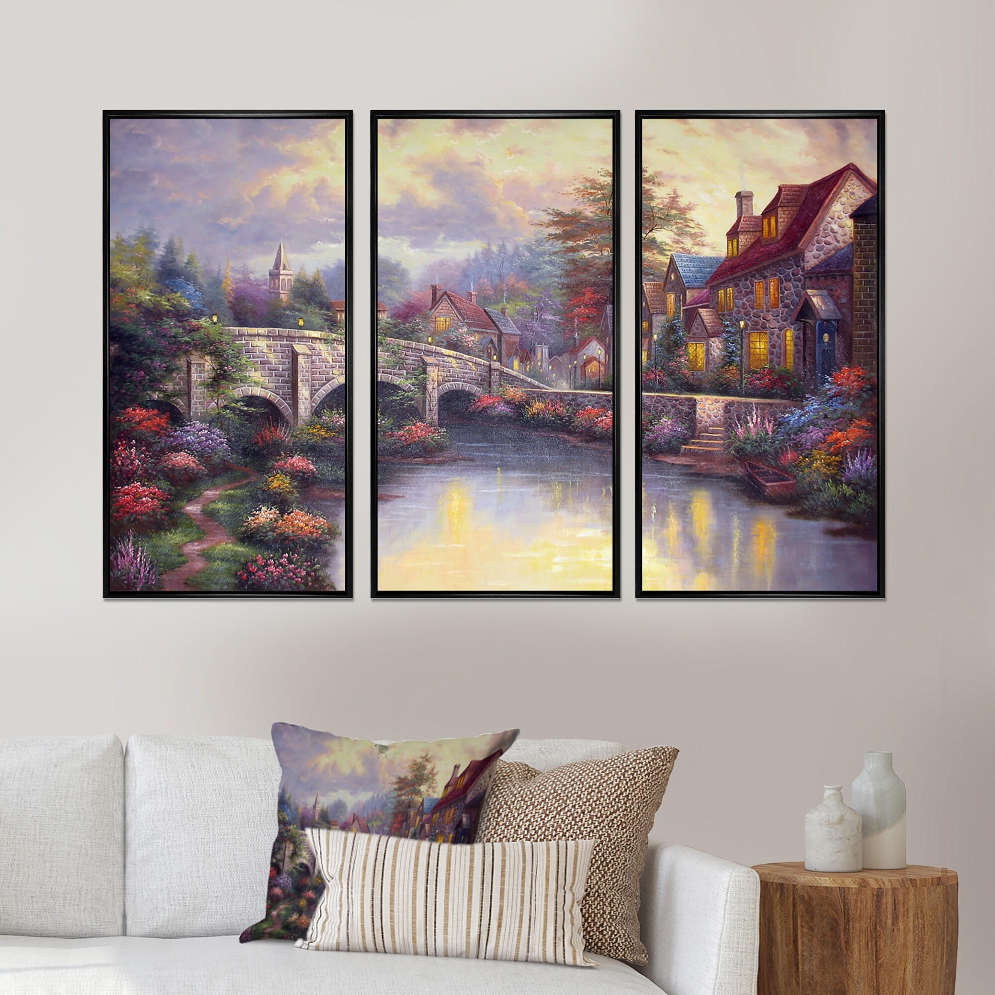 Designart "Village in Paradise" Landscape Framed Art Set of 3 - 4 Colors of Frames