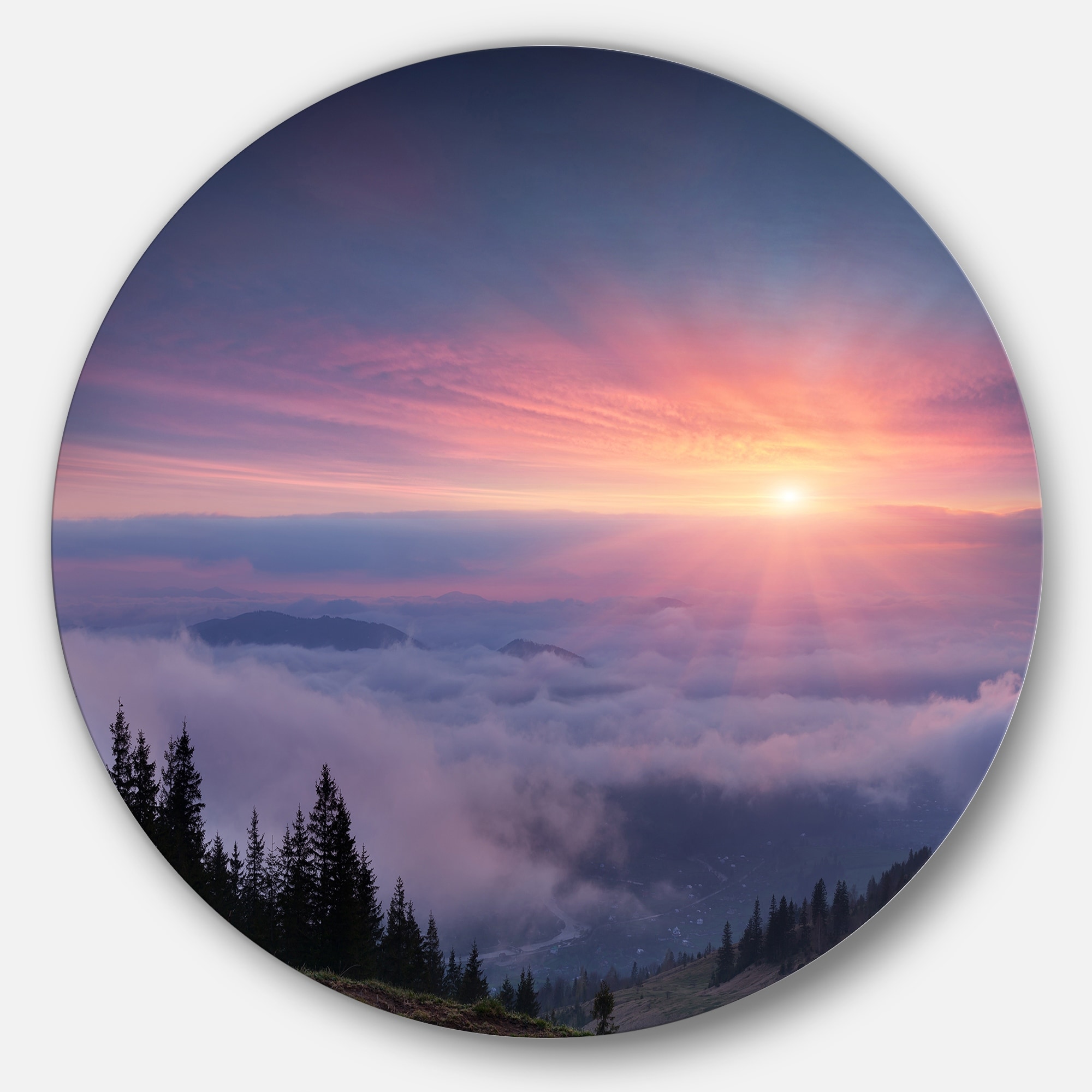 Designart 'Sunrise in Purple Sky Over Mountains' Landscape Photo Round Wall Art