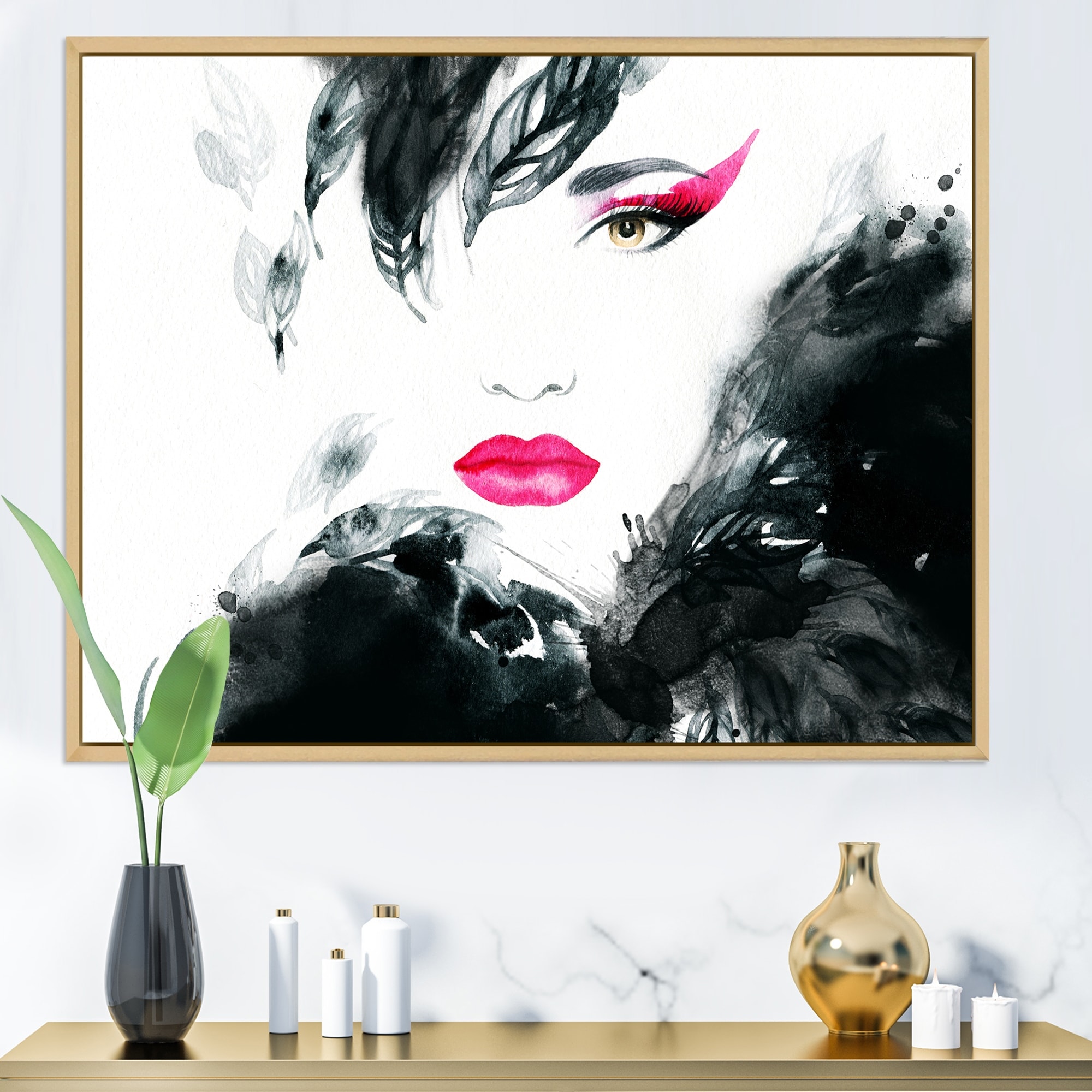 Designart "Black And White Glam Woman Portrait IV" Glam Framed Canvas Wall Decor
