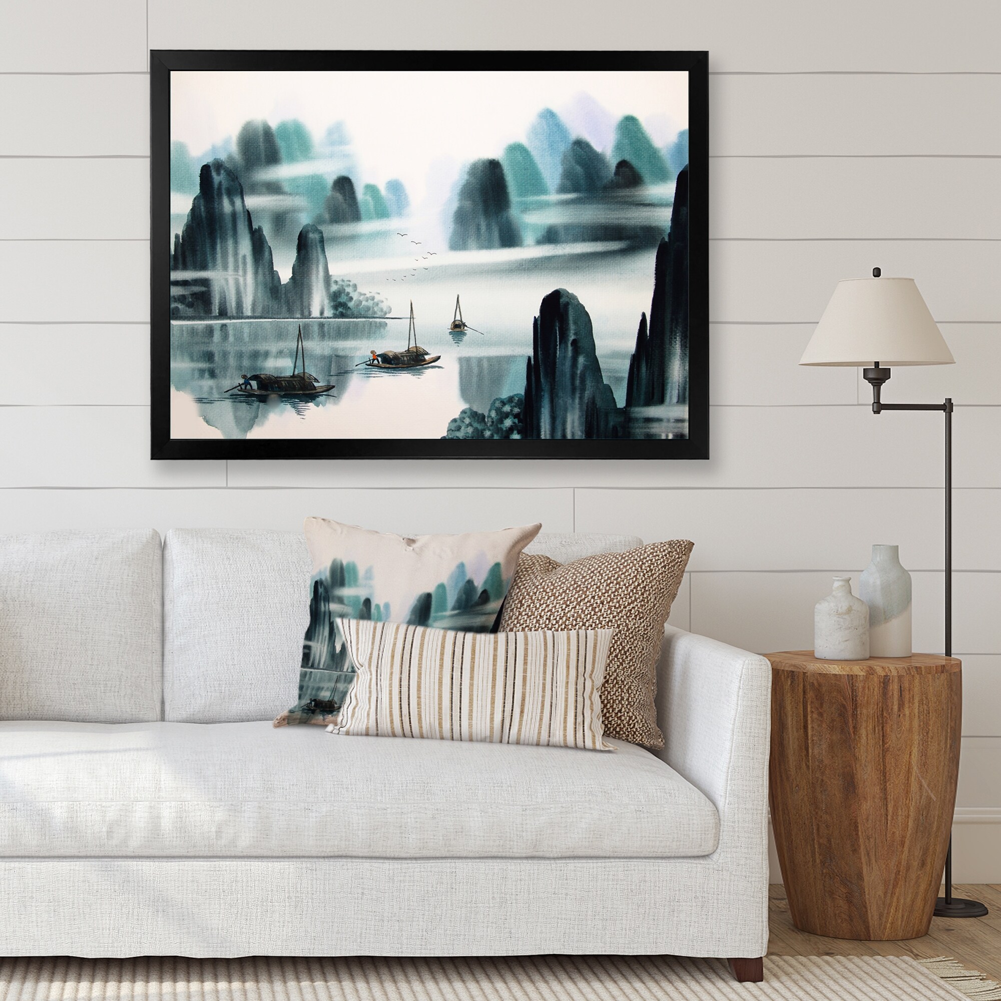 Designart "Abstract Chinese Water Landscape in Shades of Blue" Nautical & Coastal Framed Art Print