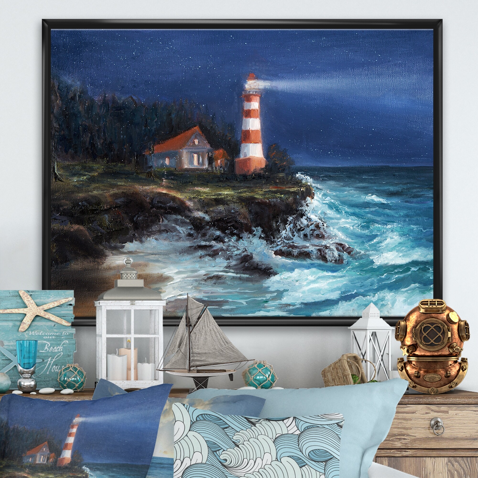 Designart "Lighthouse Shining Over Ocean At Night" Nautical & Coastal Framed Canvas Wall Art Print