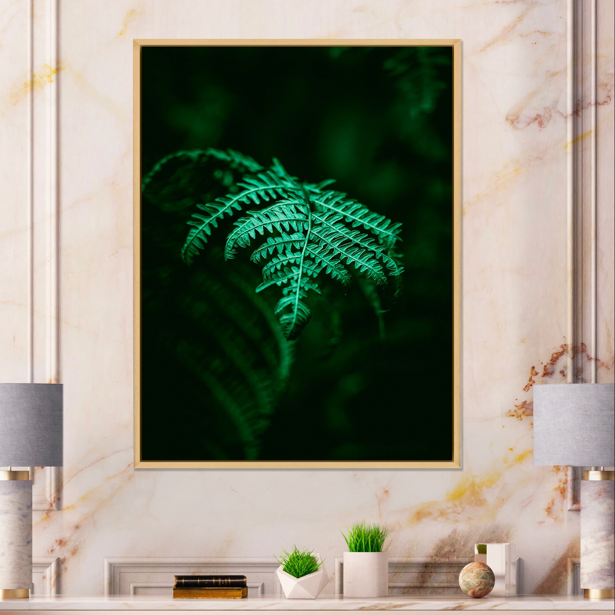Designart "Dark Green Fern on Black I" Tropical Framed Canvas Wall Art Print