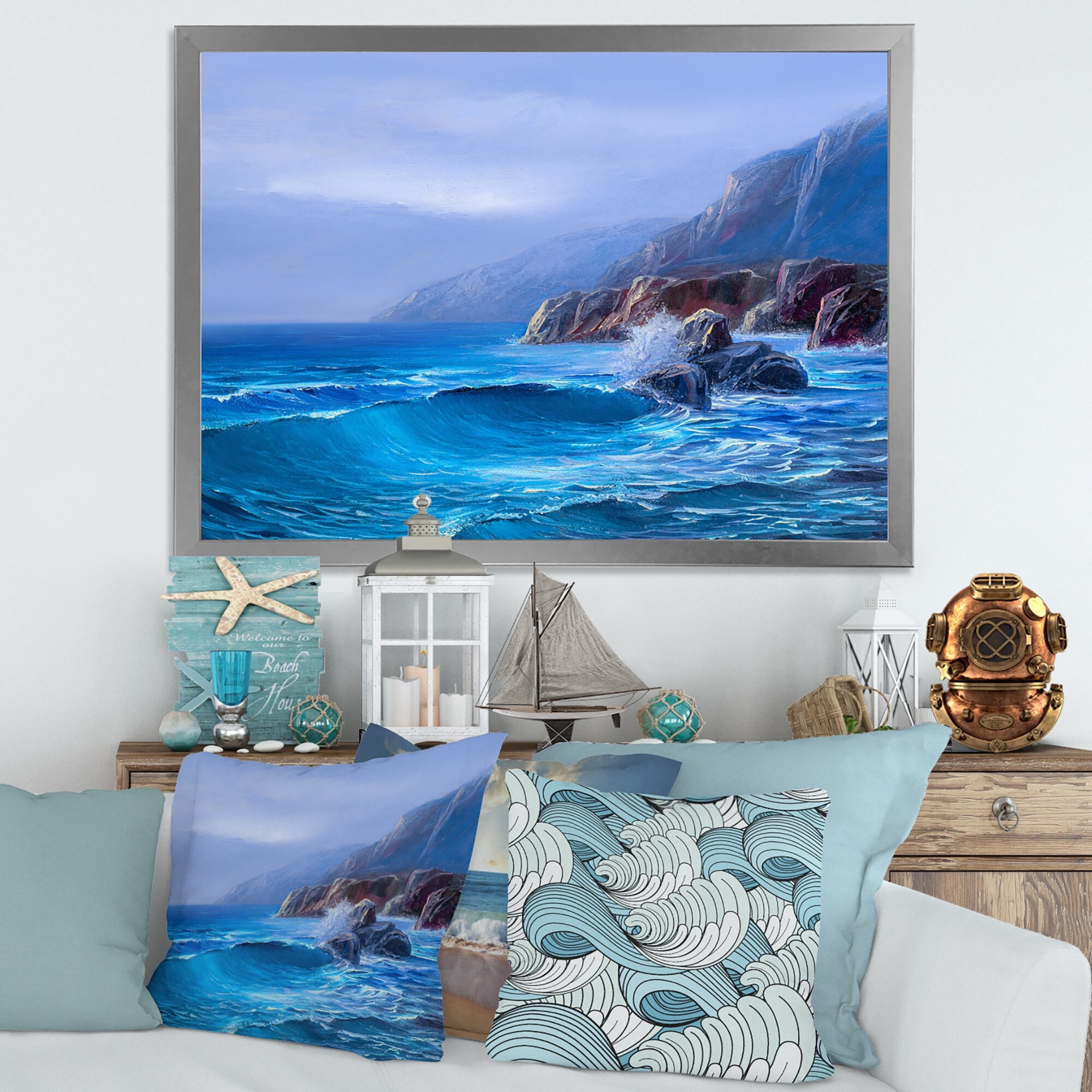 Designart "Morning on Sea Wave Paints on A Canvas" Nautical & Coastal Framed Art Print