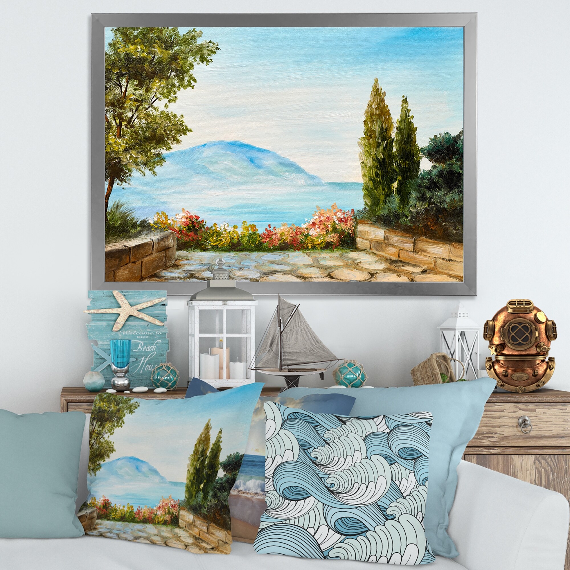 Designart "Mountains View By the Sea Side" Nautical & Coastal Framed Art Print