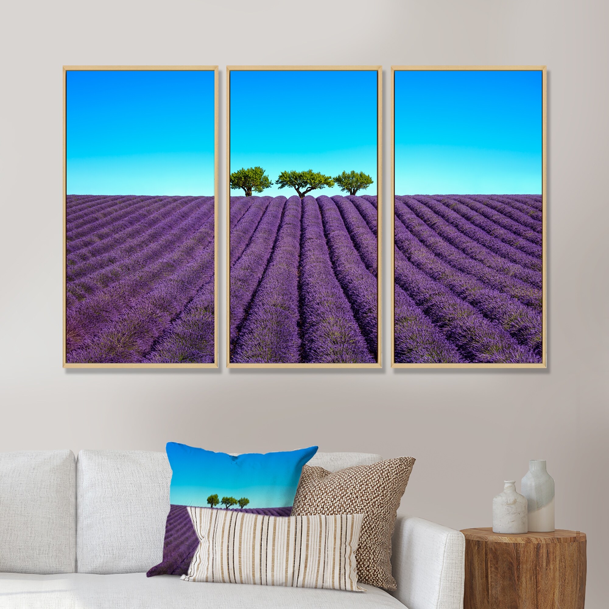 Designart "Lavender Flowers and Uphill Green Trees" Landscape Framed Canvas Wall Art Print Set of 3 - 4 Colors of Frames