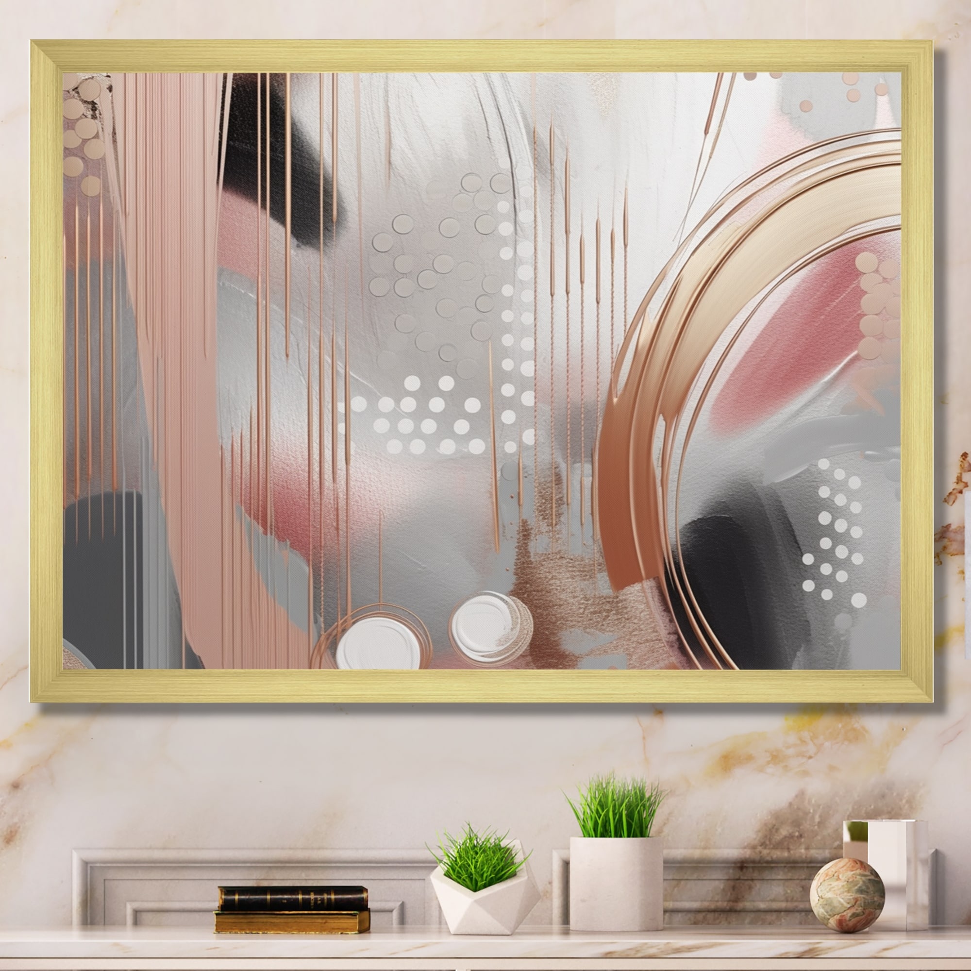 Designart "Pink Rosegold Circle Chaos Ii" Modern Shapes Transitional Framed Canvas Print