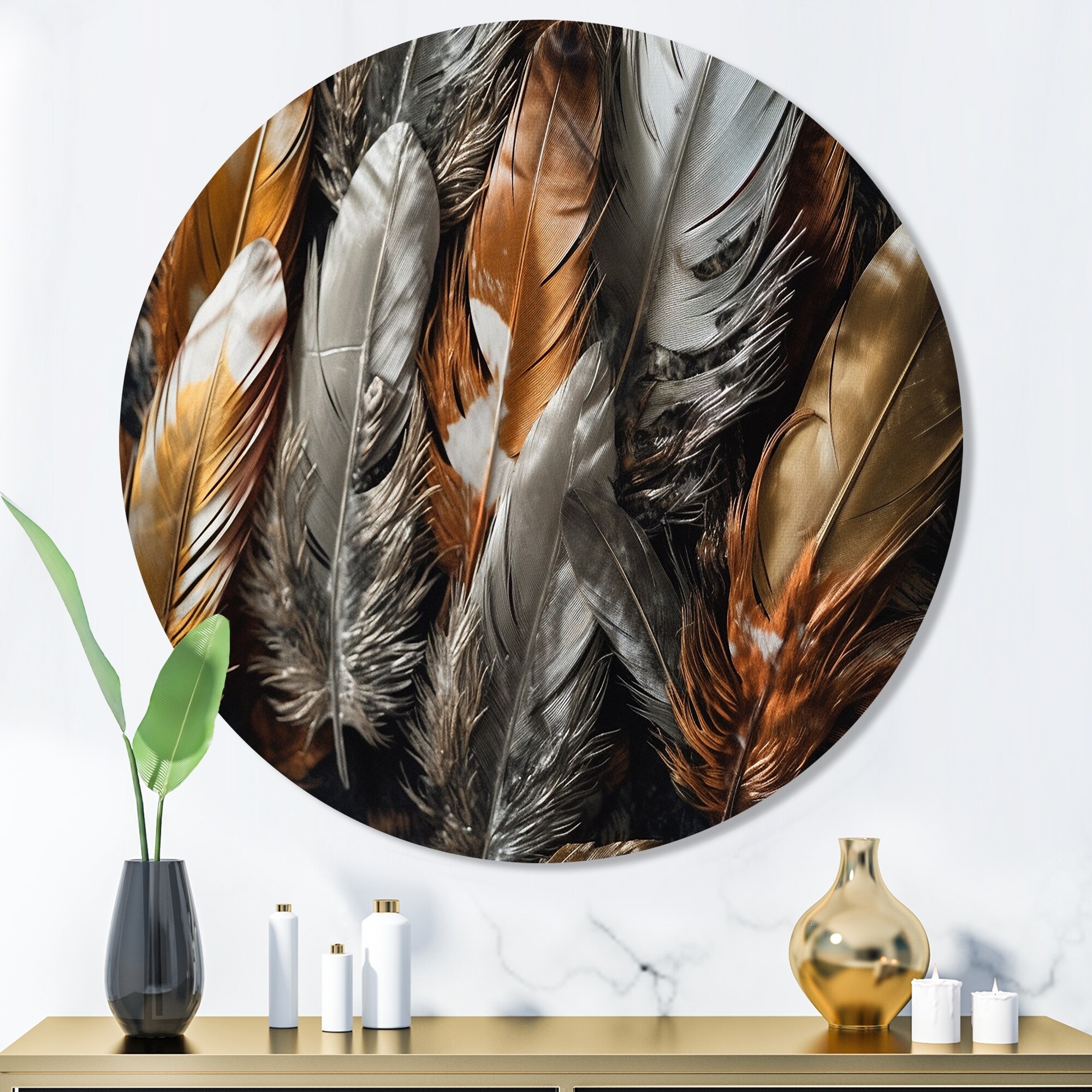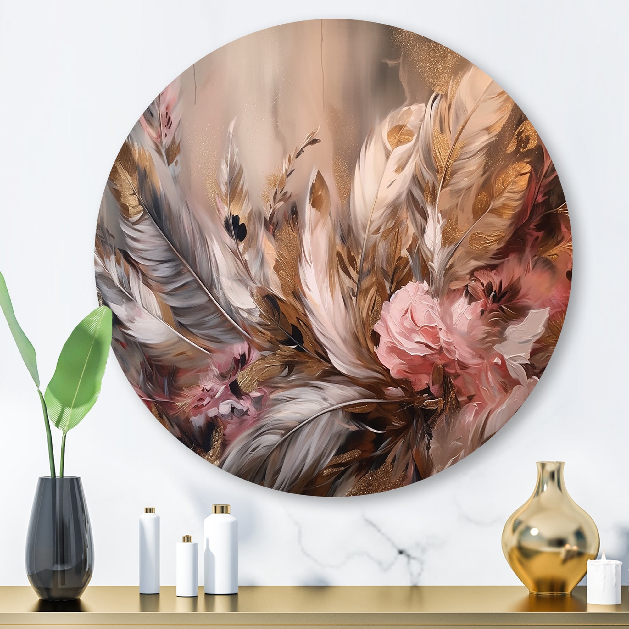 Designart "Gold Feather Extravaganza III" Glam Feather Metal Round Wall Art