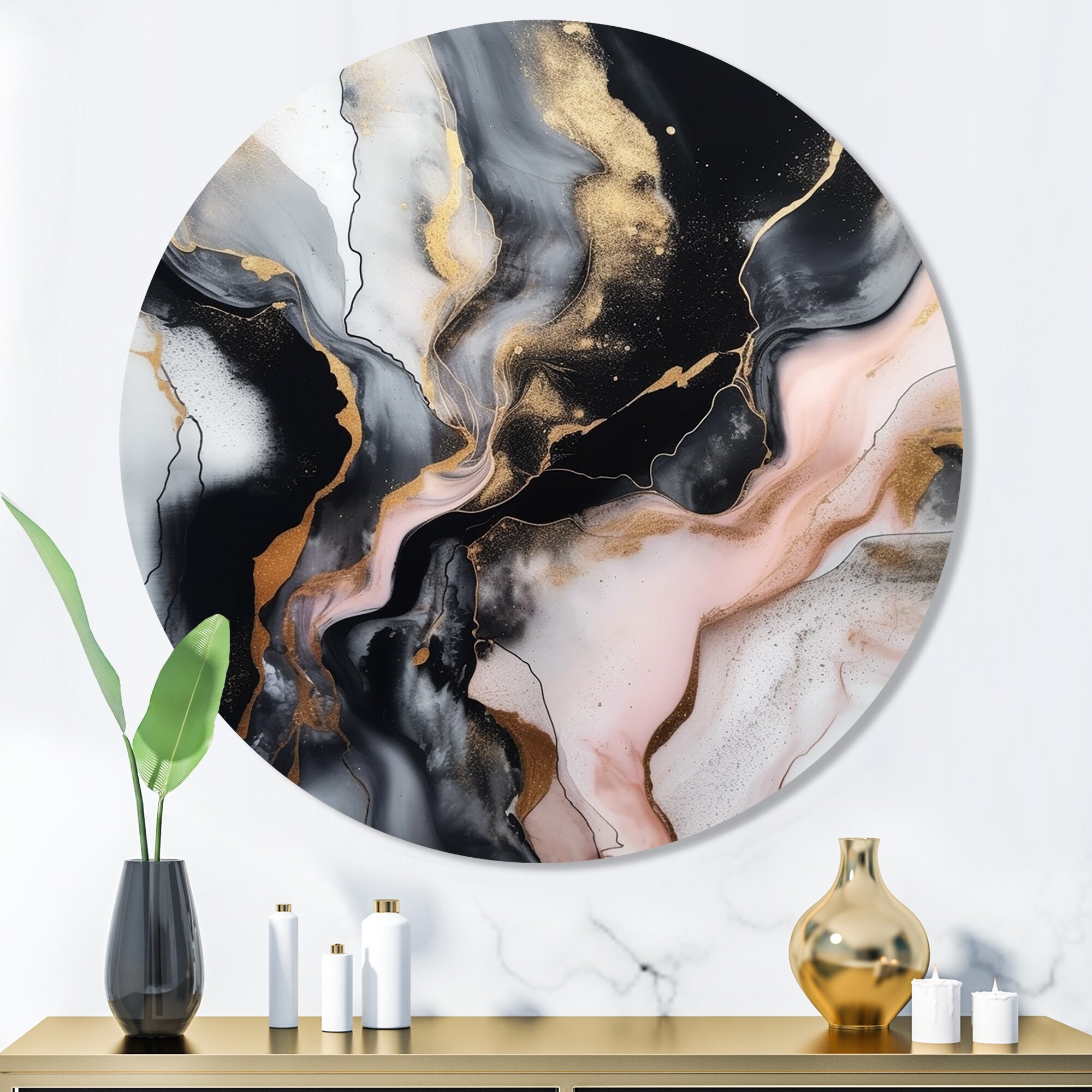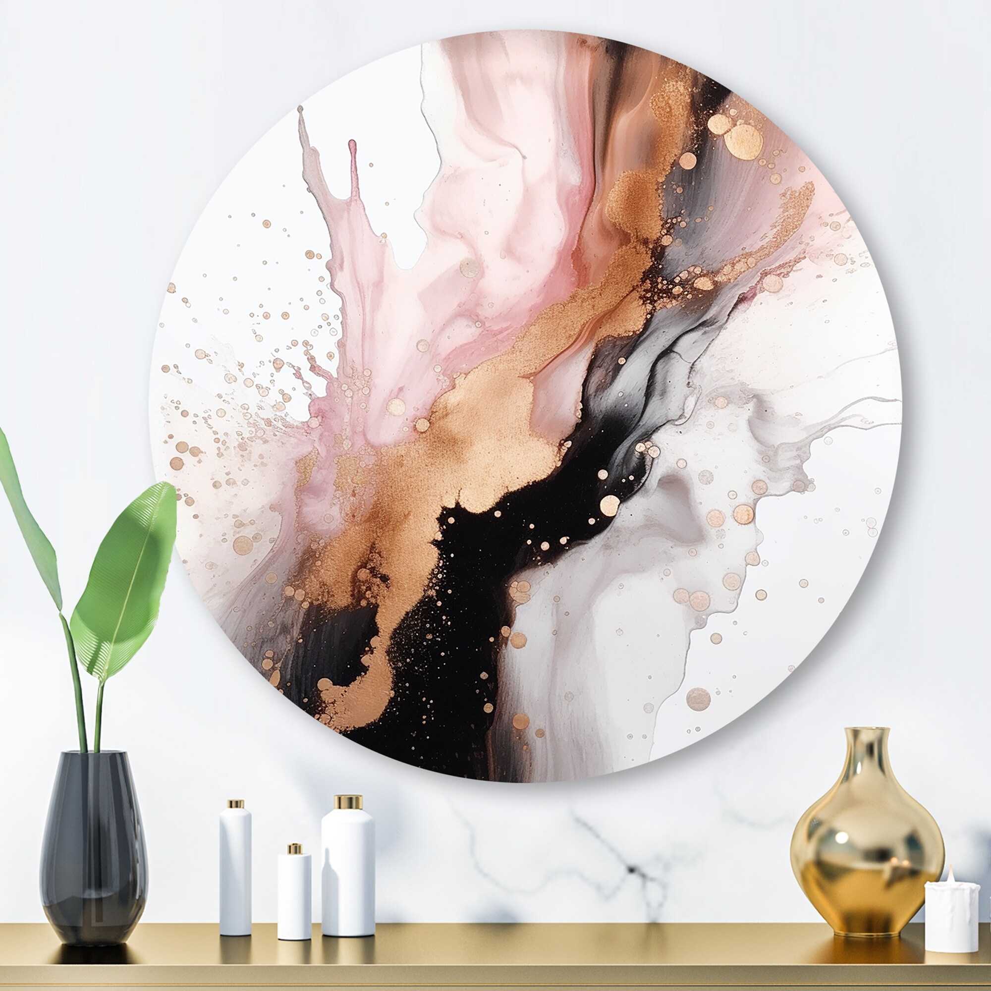 Designart "Pink Gold Texture Splash Marble I" Abstract Marble Metal Round Wall Art