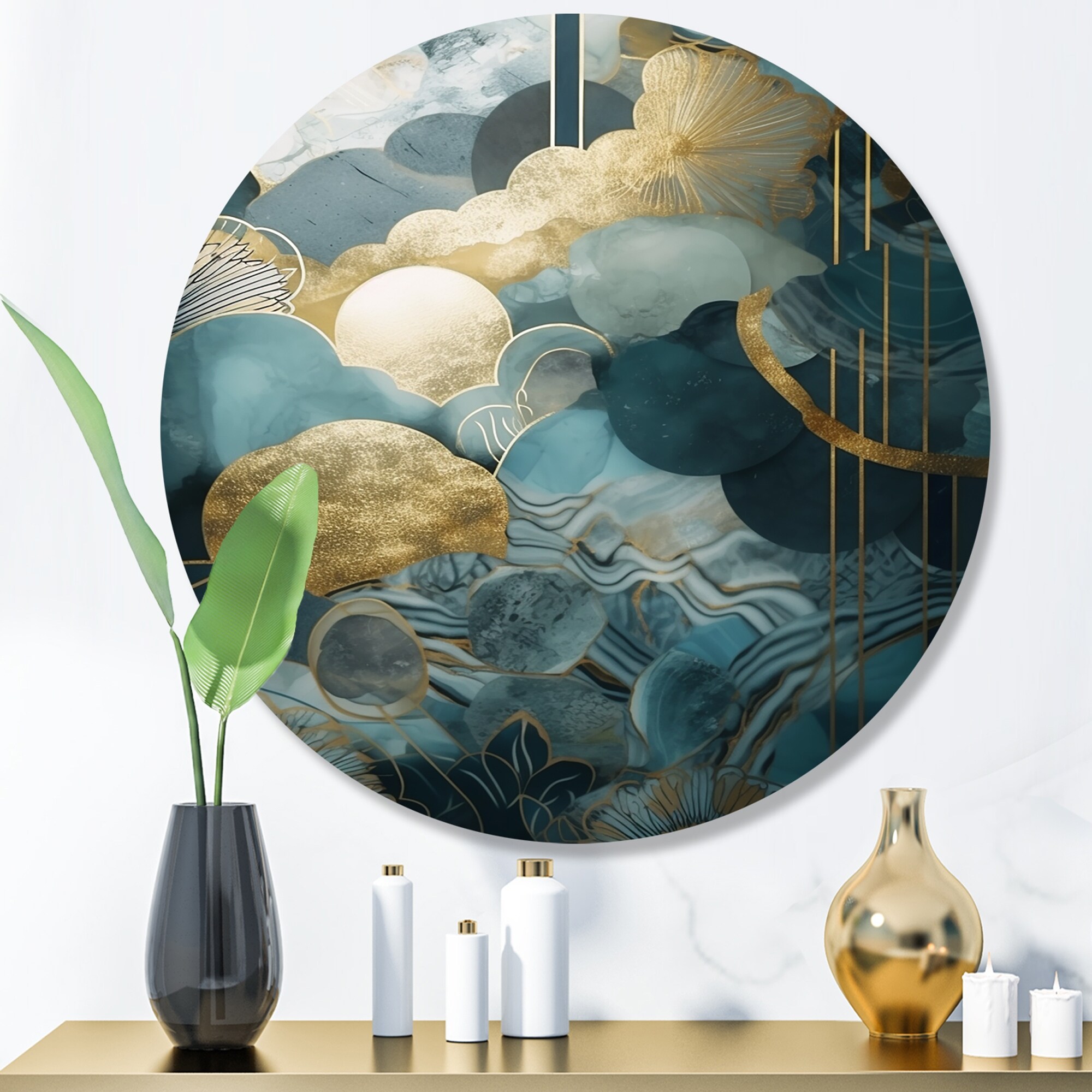 Designart "Blue And Gold Abstracted Harmonies of Nature" Abstract Floral Metal Round Wall Art