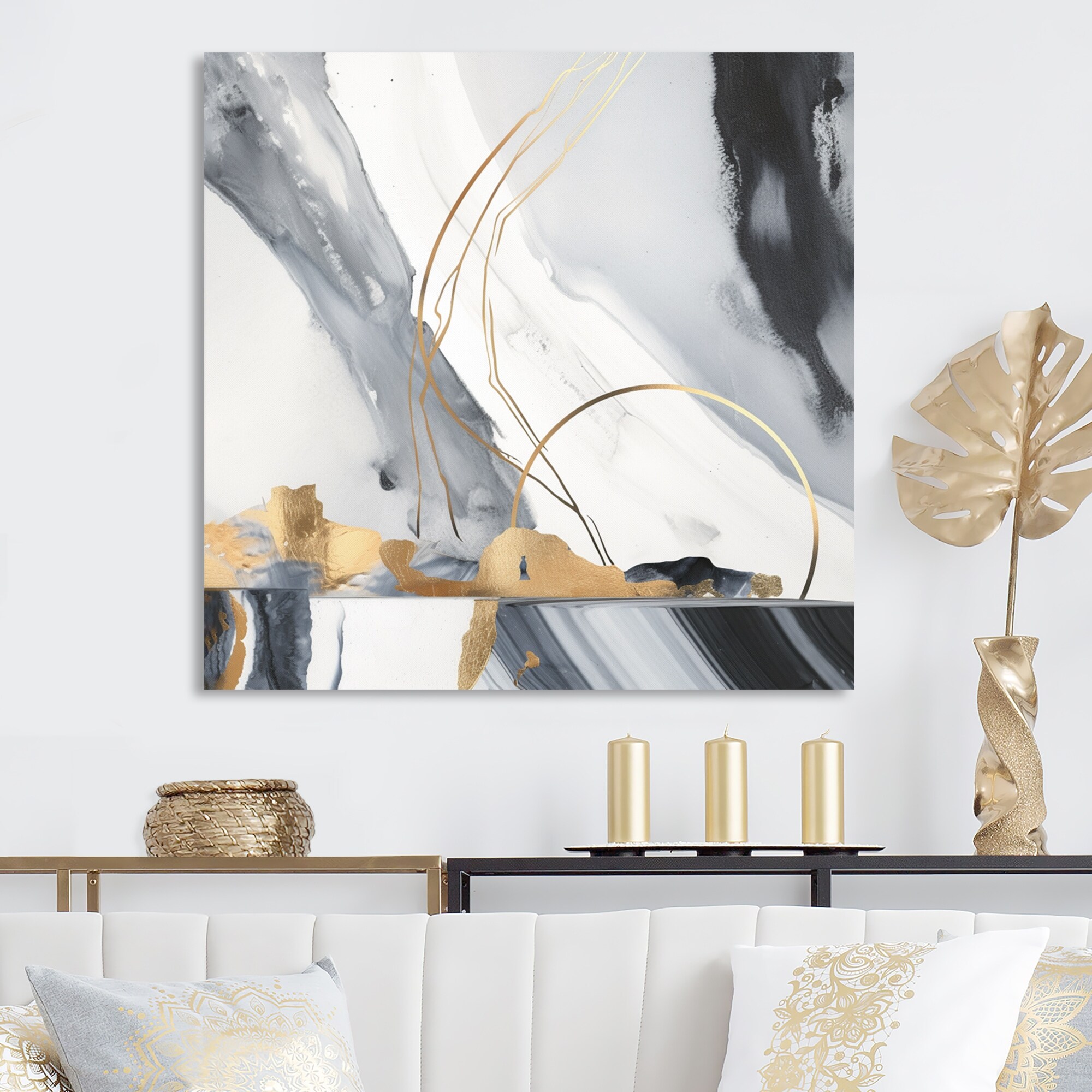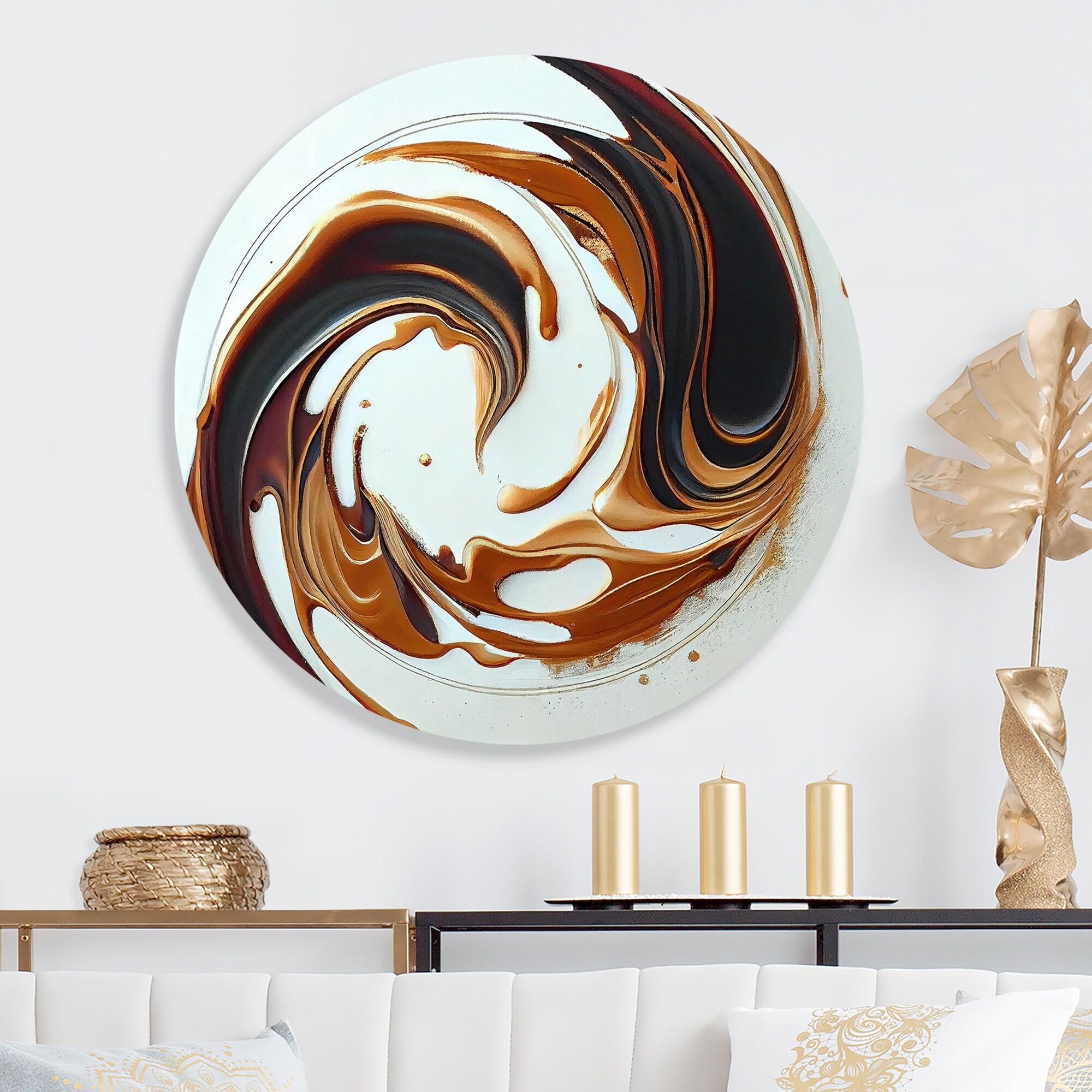 Designart 'White And Gold Bold Movement III' Modern Metal Round Wall Art