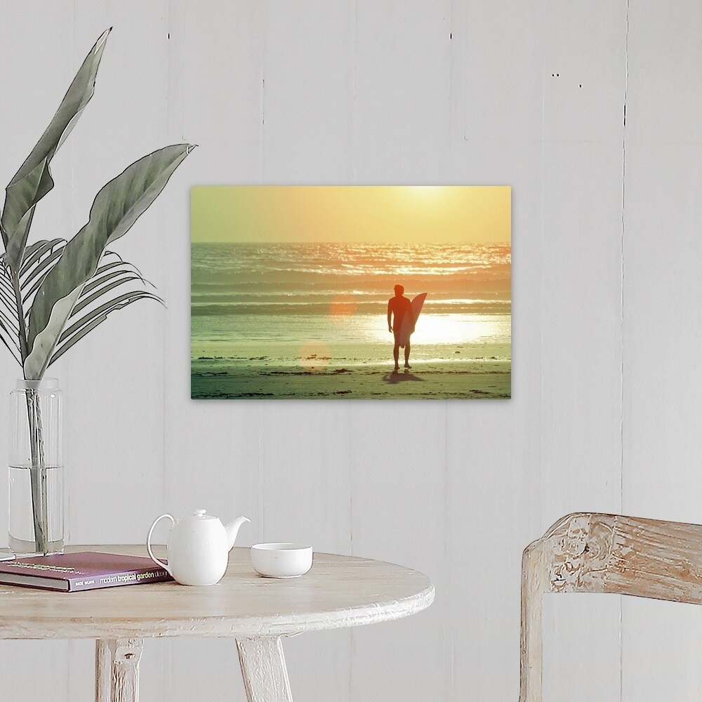 "Surfer stands by shore as sun goes down." Canvas Wall Art