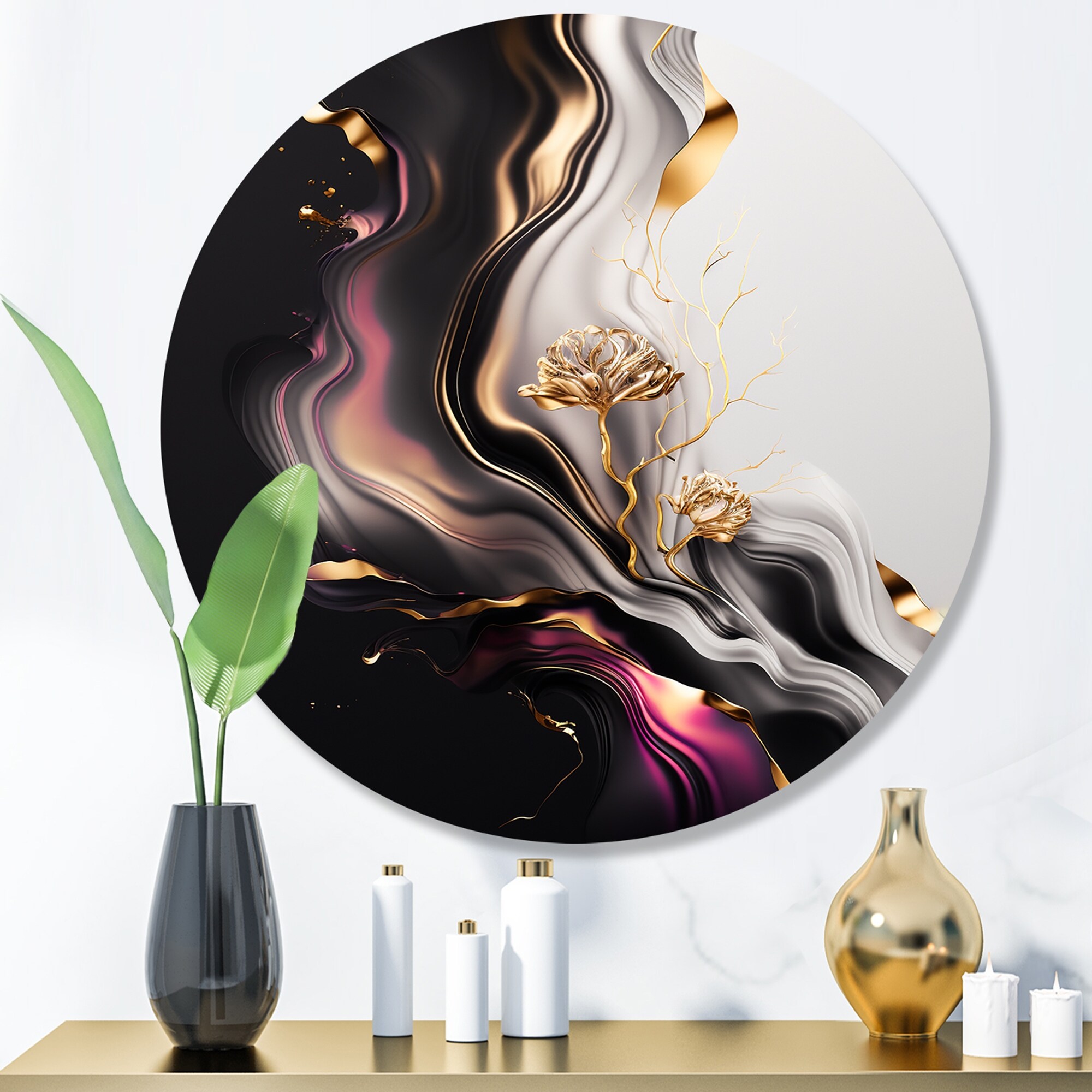 Designart "Gold And Black Marble Mirage IV" Abstract Marble Metal Round Wall Art
