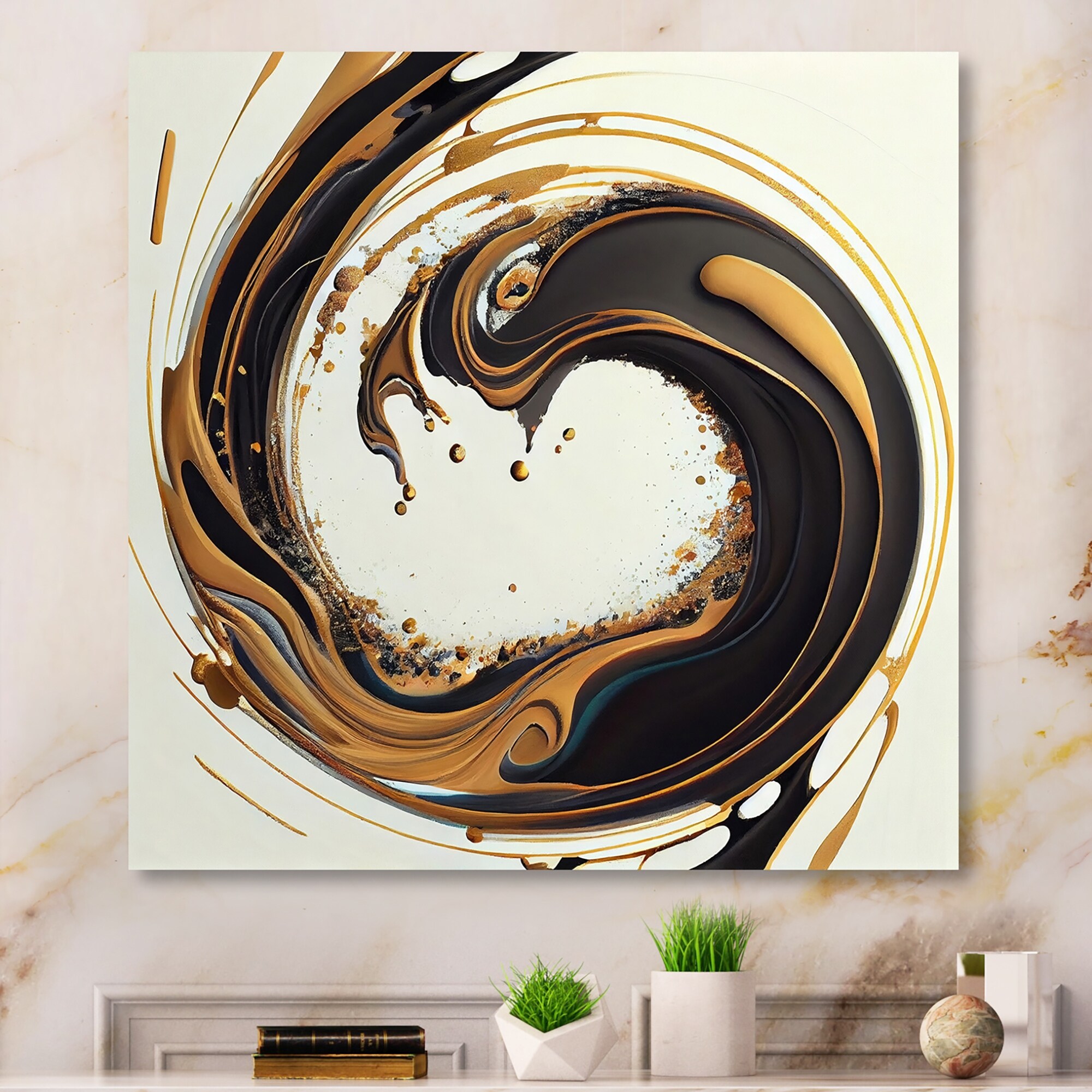 Designart "Black Gold Texture Splash Marble" Abstract Marble Metal Round Wall Art