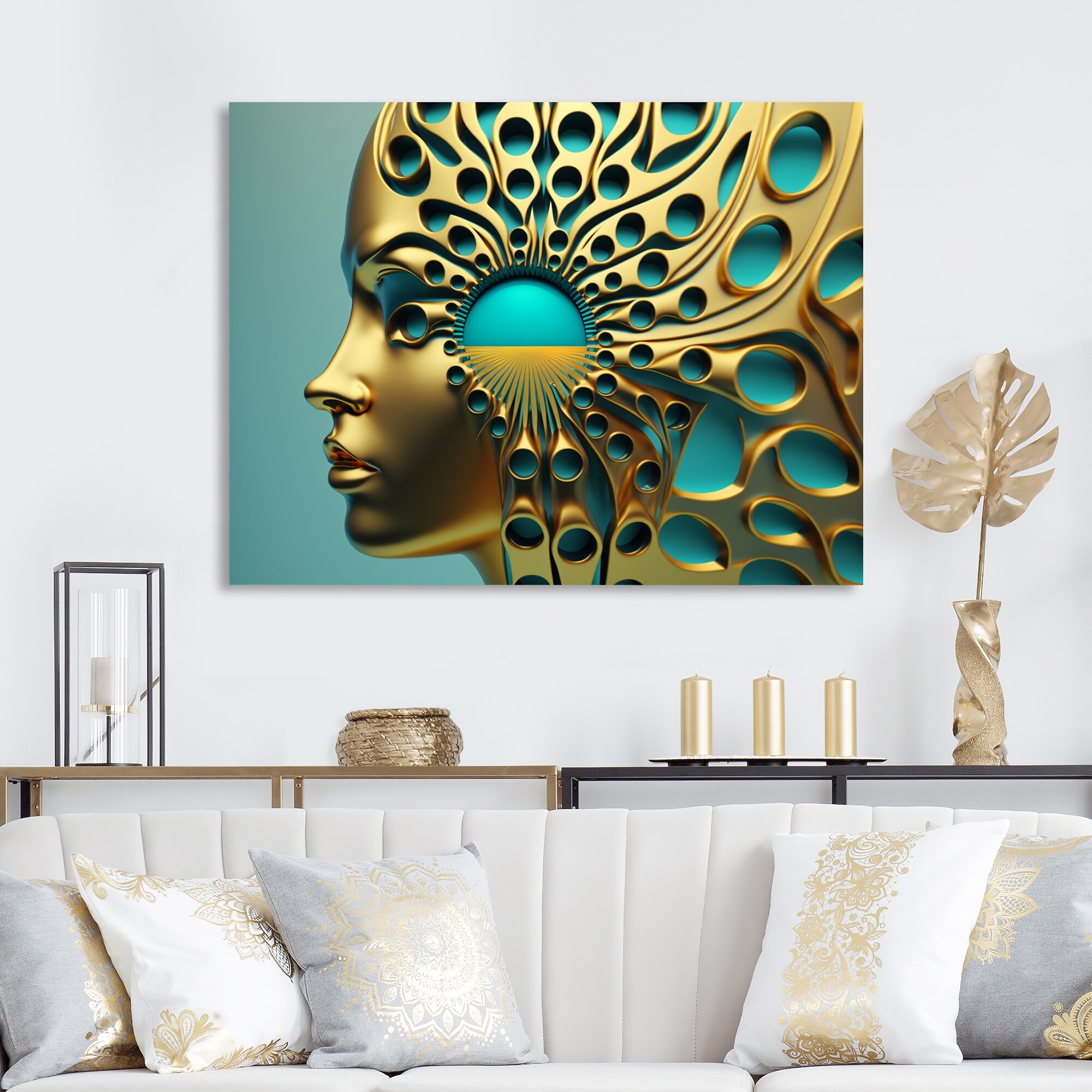 Designart 'Visionary Gold And Turquoise Goddess III' Modern Woman Metal Wall Art