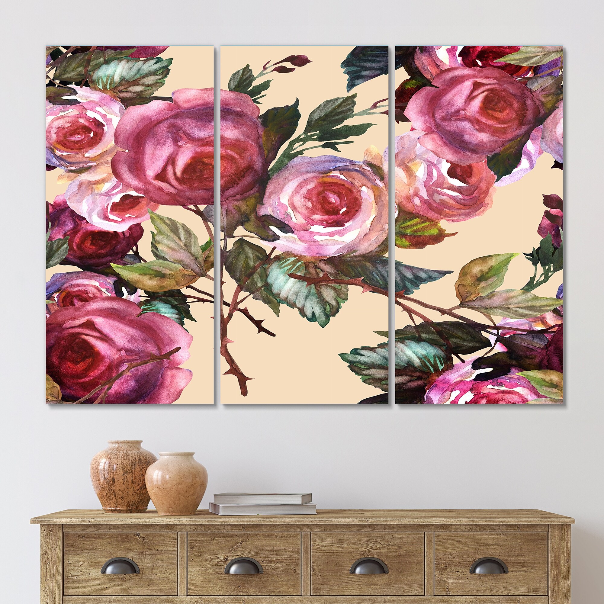 Designart "Pink Vintage Roses on Yellow" Patterned Canvas Wall Art Print