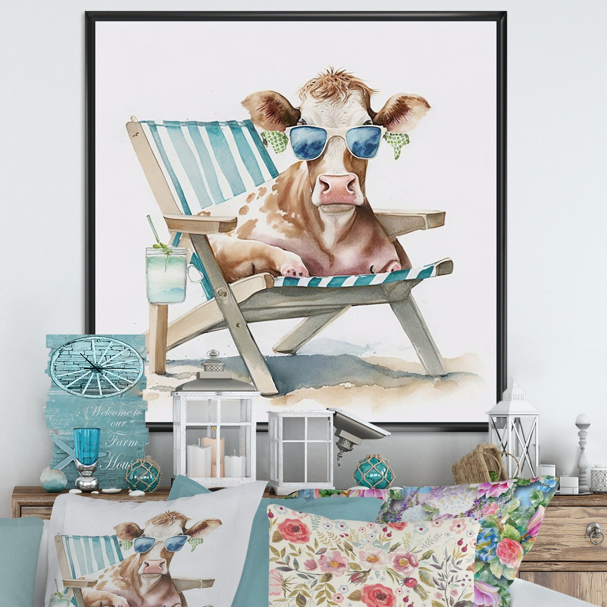 Designart "Cow Lounging With Sunglasses I" Farmhouse Framed Canvas Art Print
