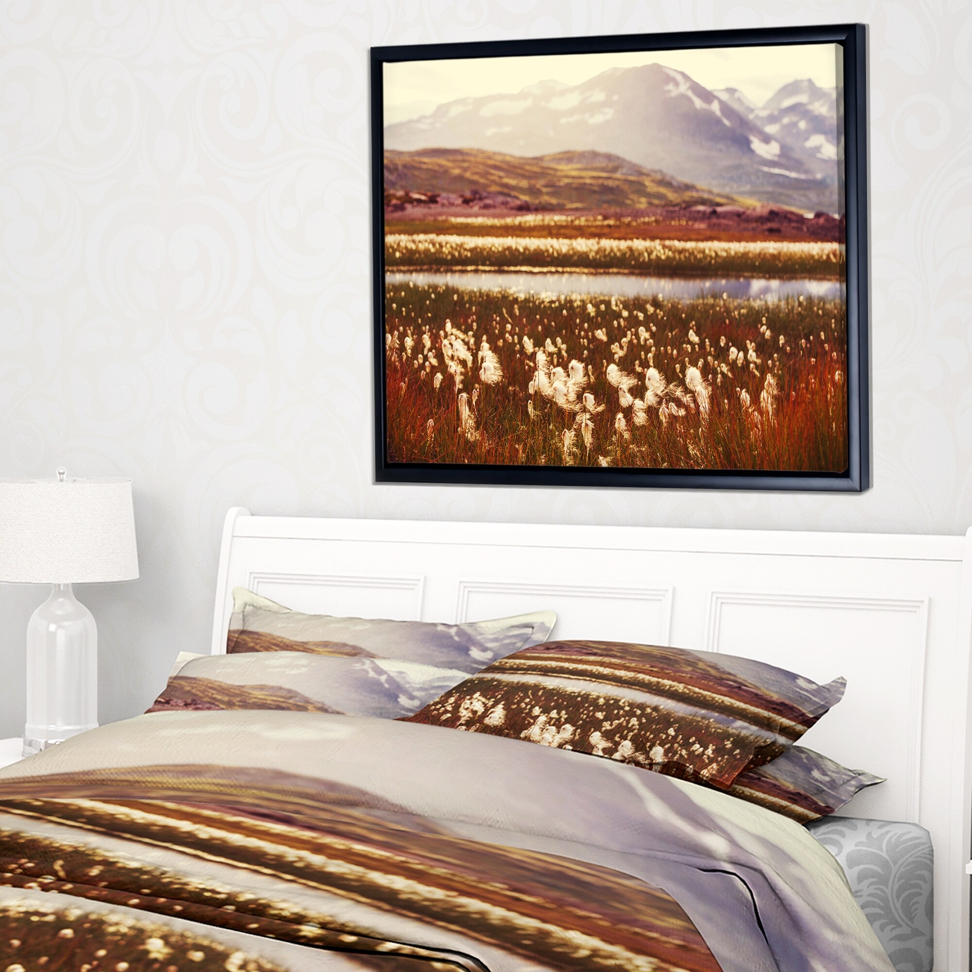 Designart "Cotton Flowers with Hills on Background" Floral Framed Canvas Art Print