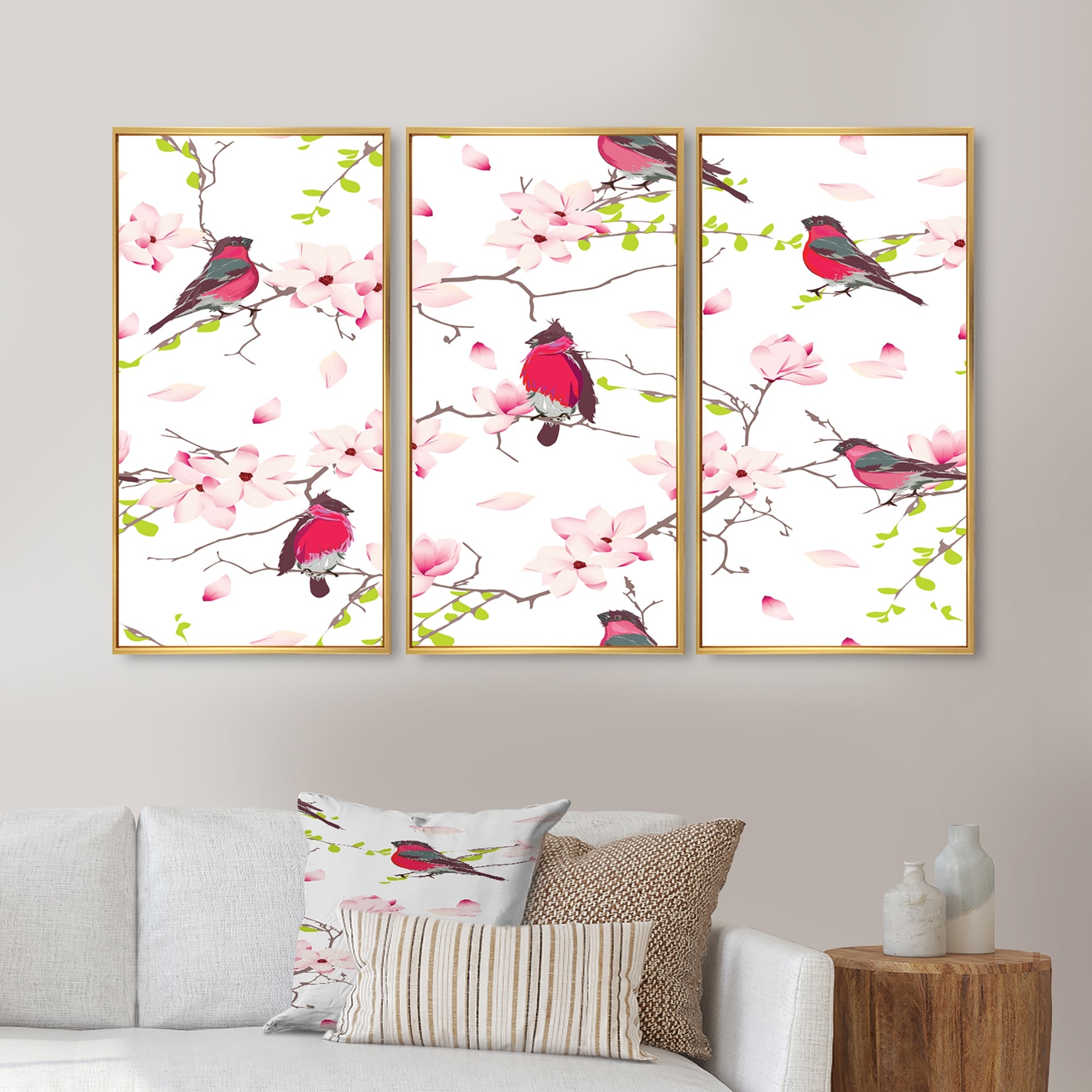 Designart "Red Bullfinches on Magnolia Tree" Traditional Framed Artwork Set of 3 - 4 Colors of Frames