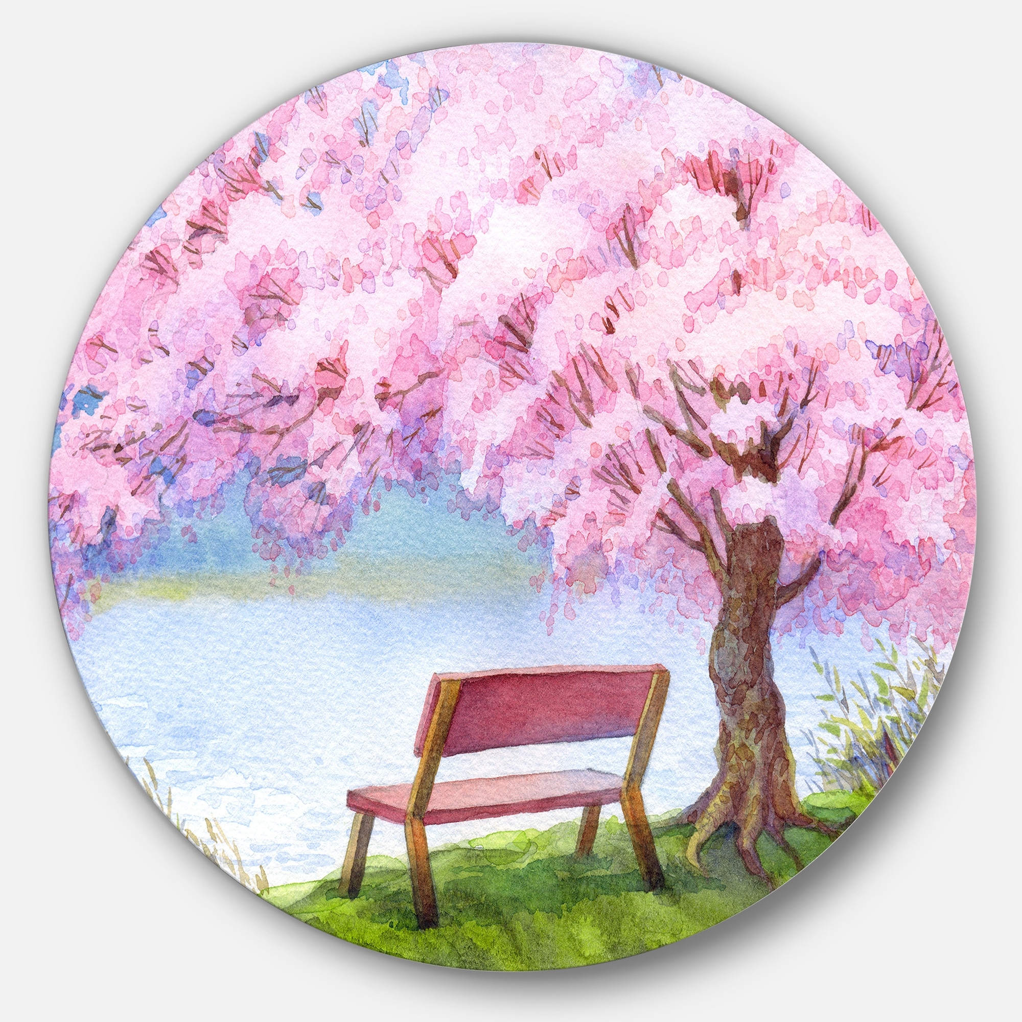 Designart 'Bench under Flowering Peach Tree' Floral Glossy Large Disk Metal Wall Art