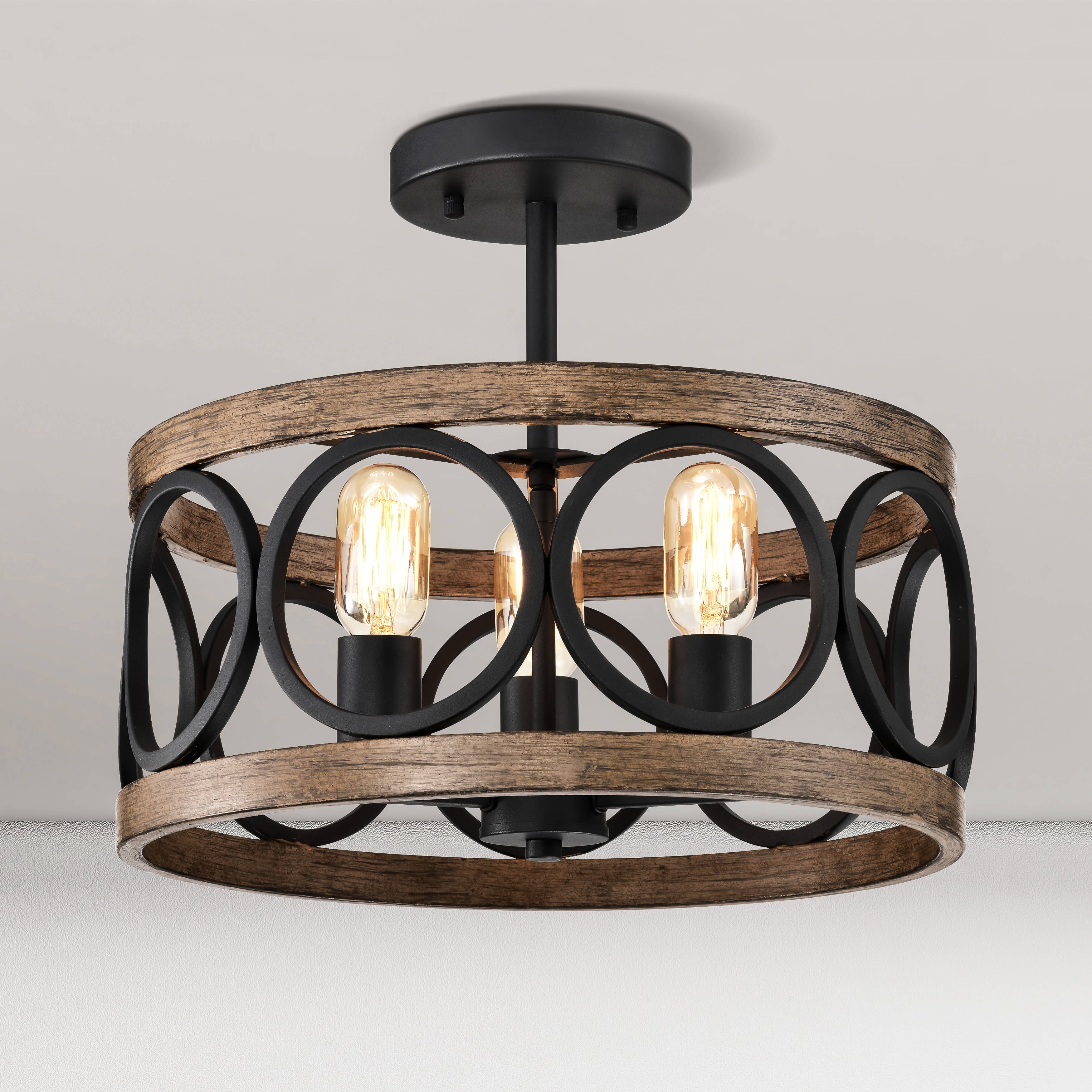 Raquel 3-Light Matte Black and Faux Wood Finish Drum Flush Mount - 16 inches in diameter x 13.8 inches H