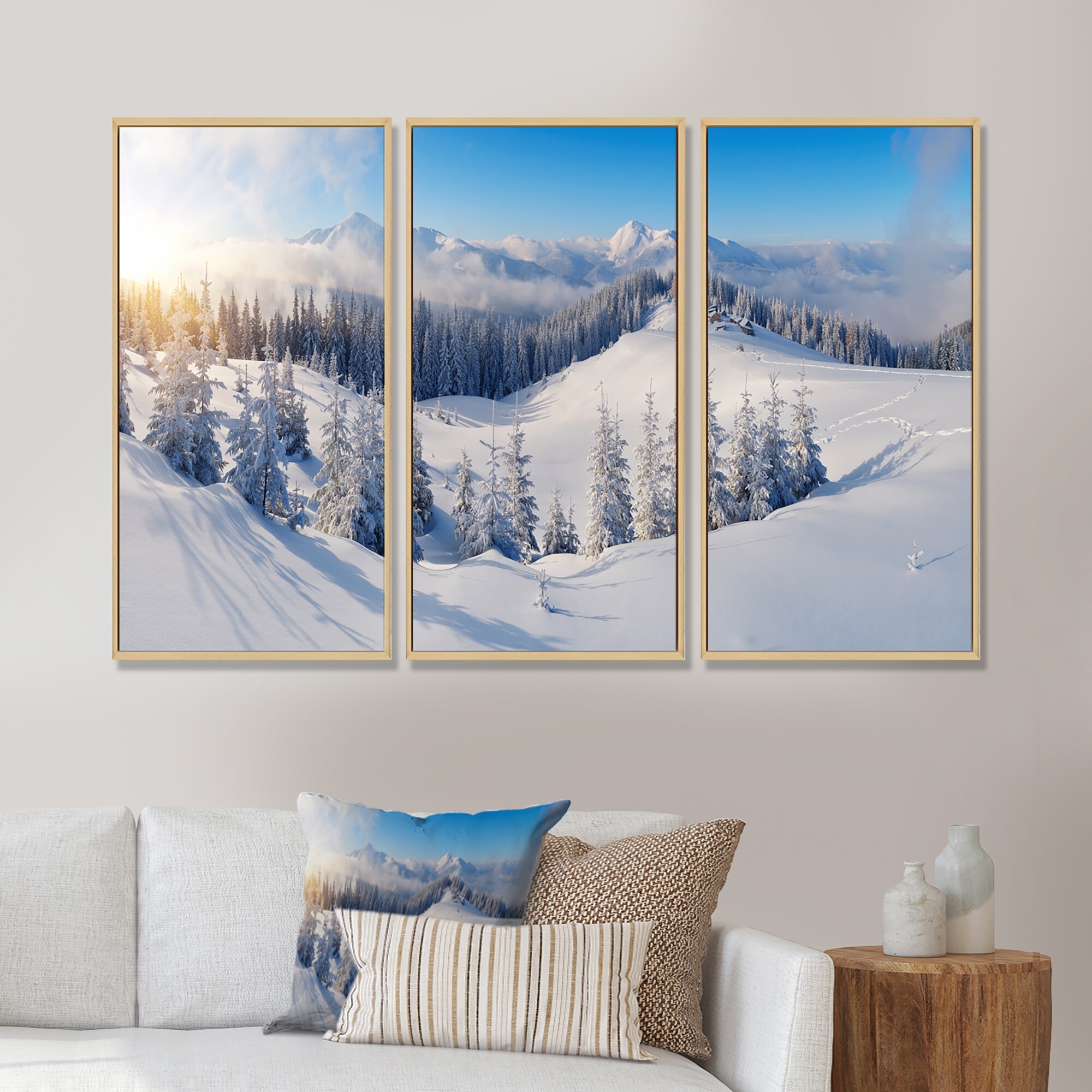 Designart "Snowy Winter Landscape With Pines II" Cabin & Lodge Framed Canvas Wall Art Print Set of 3 - 4 Colors of Frames
