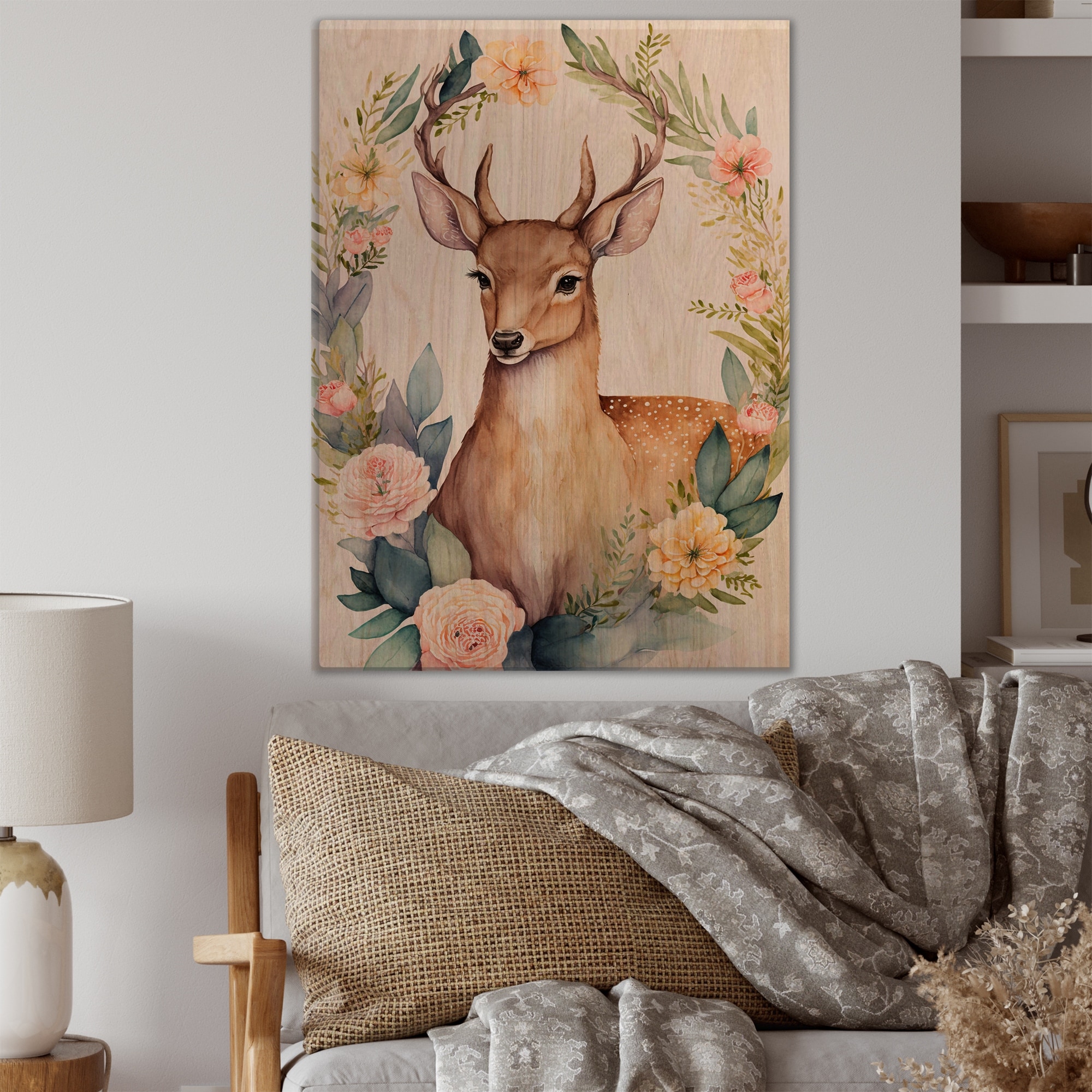 Designart 'Cute Little Deer With Pink Flowers' Animal Deer Landscape Wood Wall Art - Natural Pine Wood