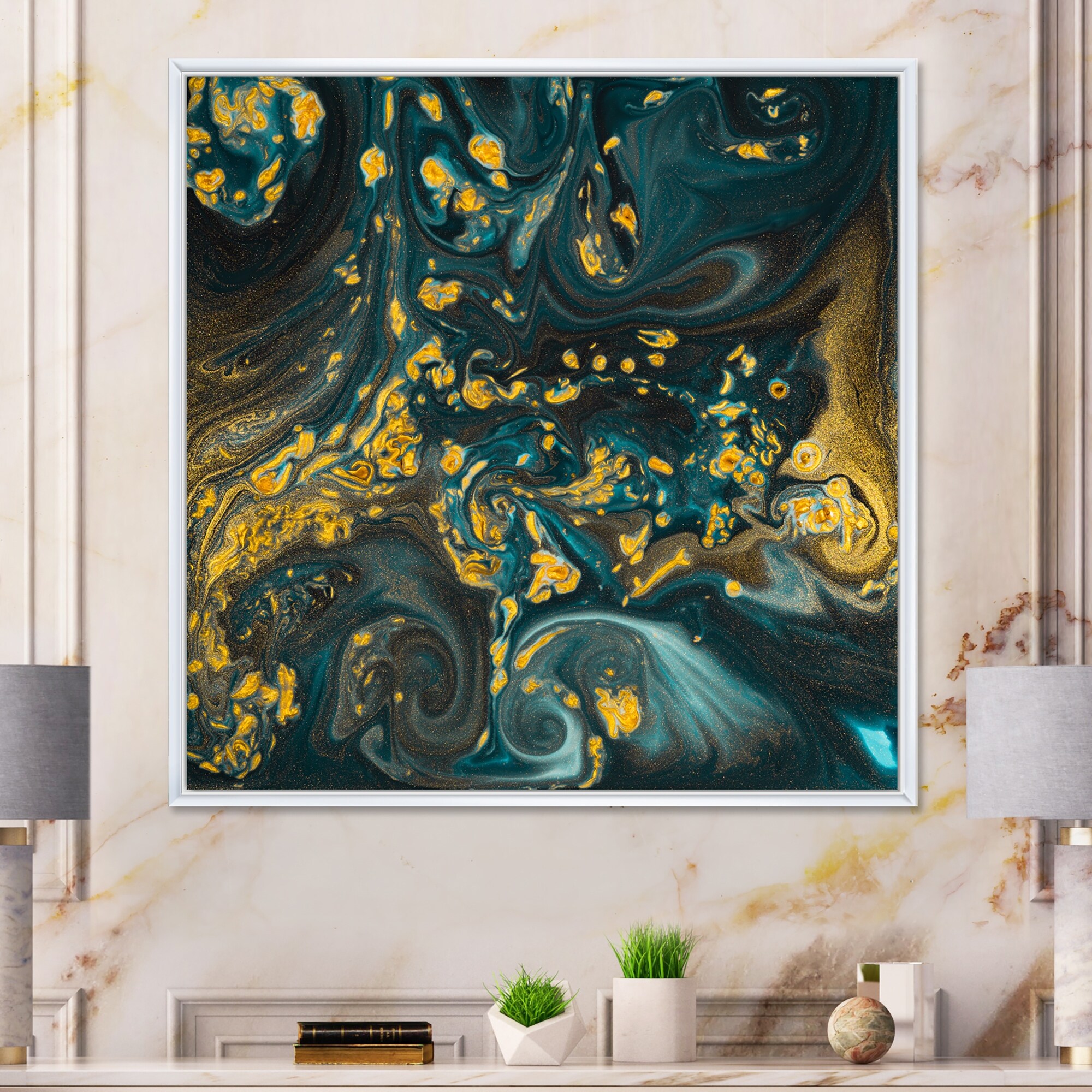Designart "Luxury Blue Golden Marble Art XIII" Modern Framed Canvas Art Print